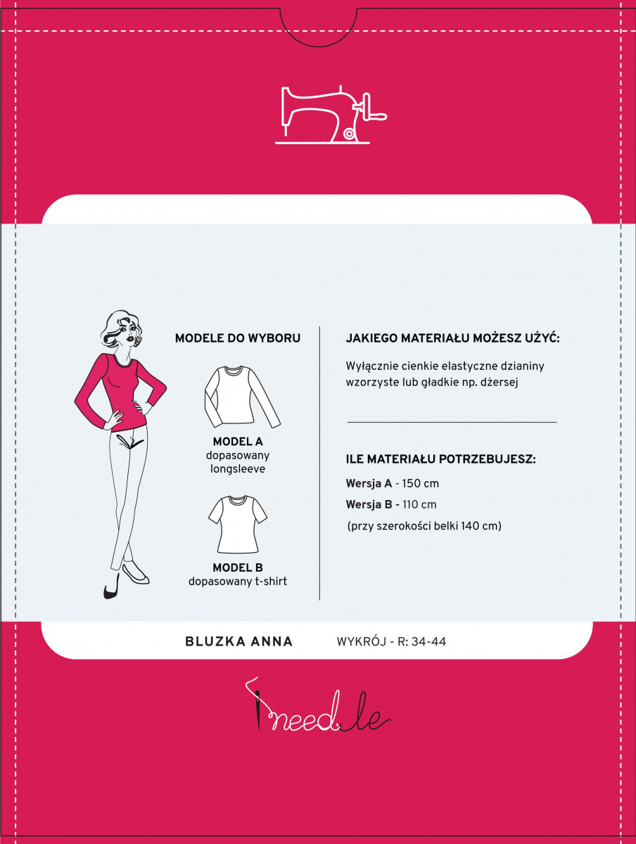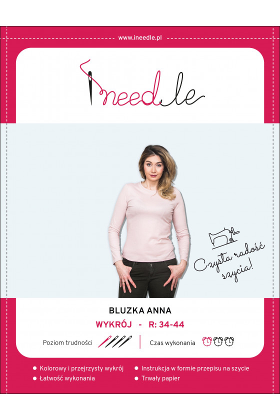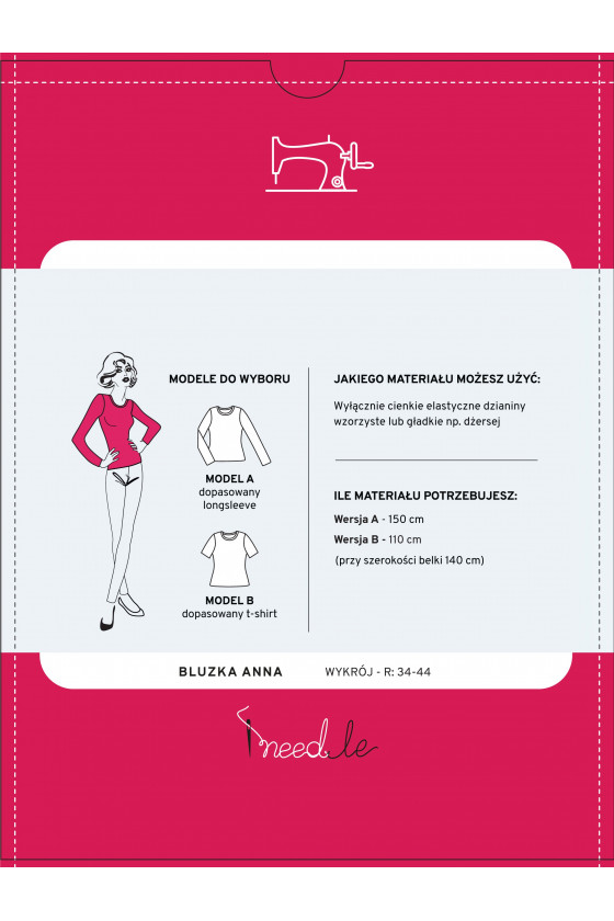 Ett mönster för en klassisk, grundläggande blus som passar till allt och, beroende på vilket material vi syr den av, kan vara mer elegant eller avslappnad. Ett enkelt och mycket läsbart mönster hjälper dig att sy två typer av basblus; med långa eller korta ärmar i storlekarna 34 till 44. Använd ett stickat tyg som är behagligt att ta på och lek med färg. Denna blusmodell kan sys med både korta och långa ärmar (båda versionerna finns på mönstret). Blusen Anna passar till bokstavligen allt. Den kommer att vara perfekt under en jacka, kofta eller sweatshirt, men den kommer också att vara perfekt som en oberoende outfit. Mönstret till blusen Anna är anpassat till figuren och dess längd sträcker sig runt midjan.