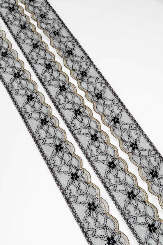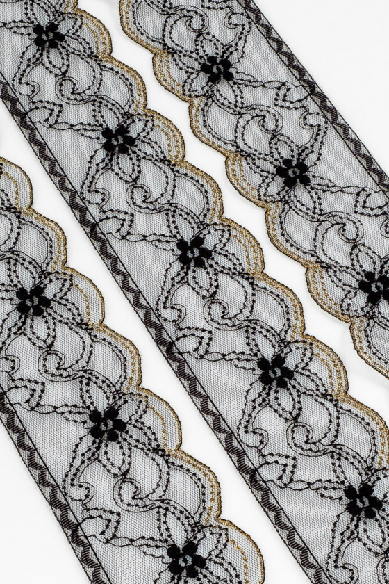 Italiensk spetstejp i svart, avslutad med en tand på ena sidan. Delikat dekorerad med guld. Notera: tejpen är styv.