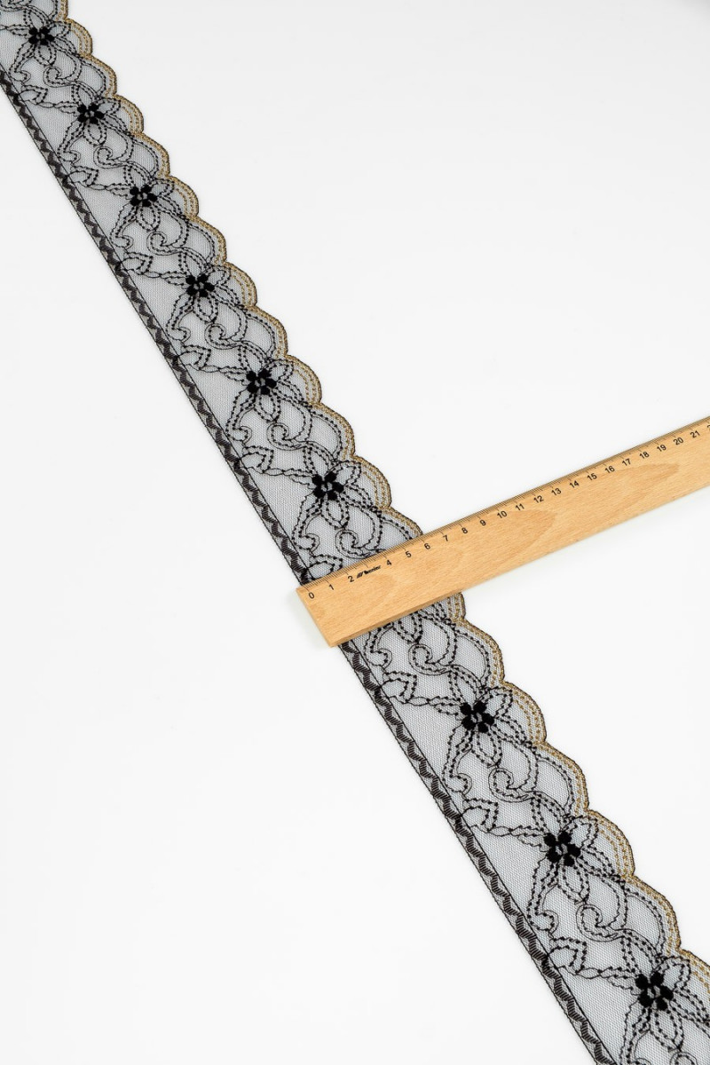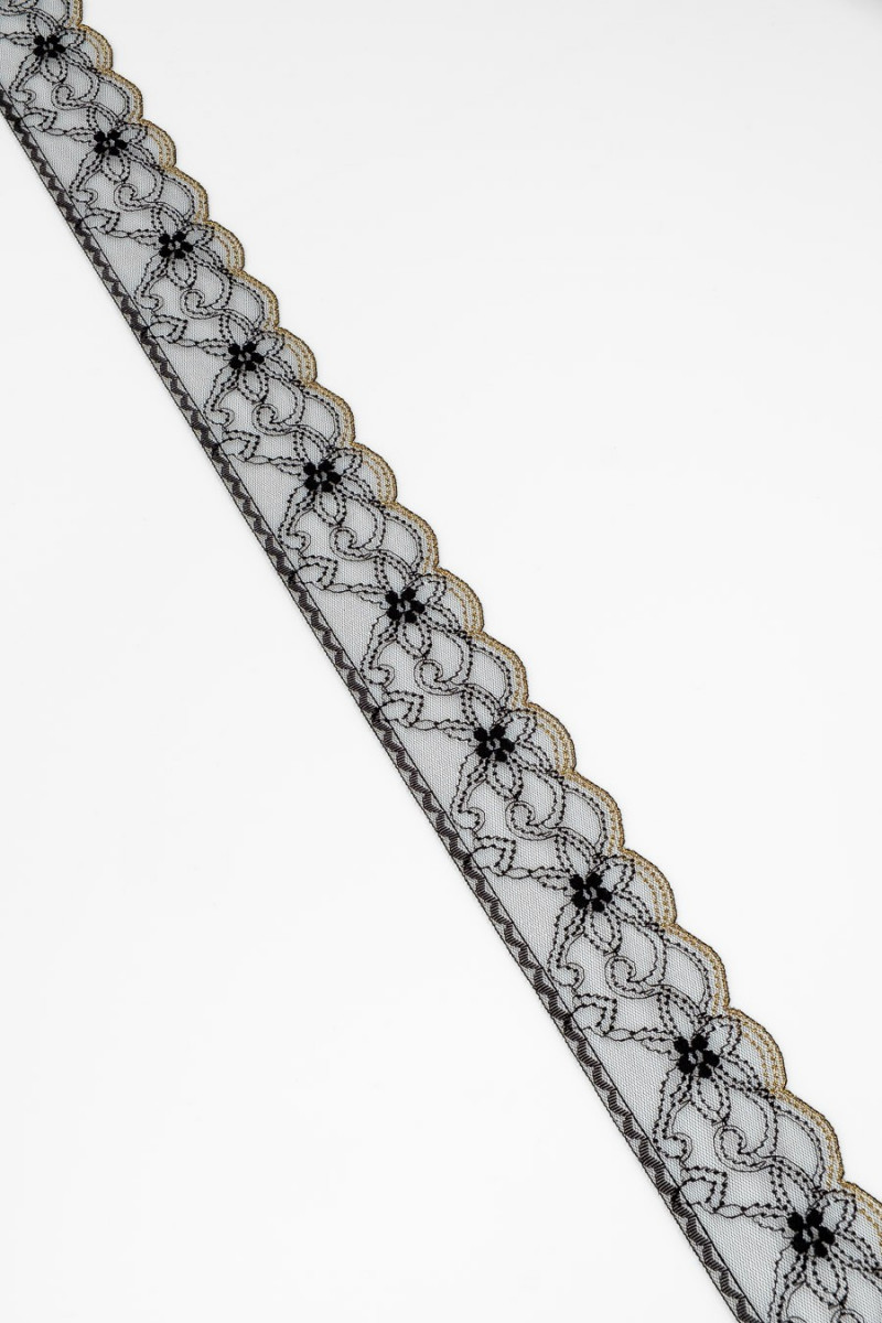 Italiensk spetstejp i svart, avslutad med en tand på ena sidan. Delikat dekorerad med guld. Bredd: 6 cm.