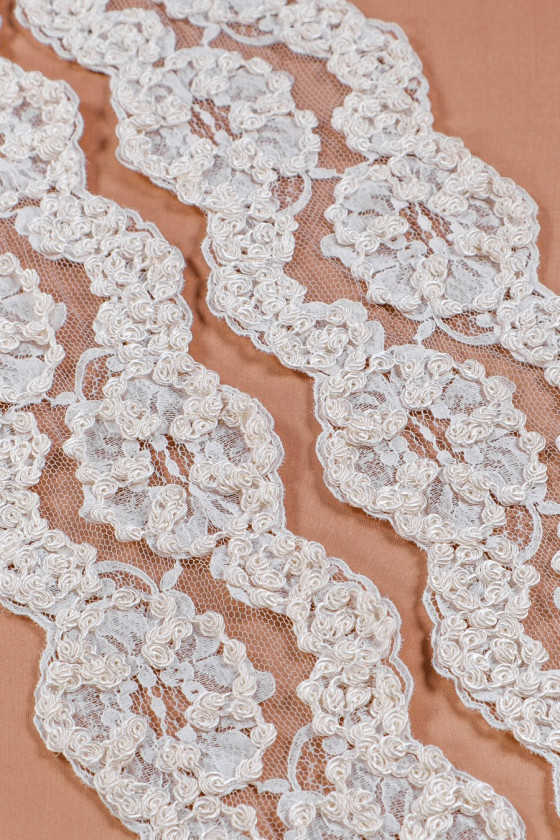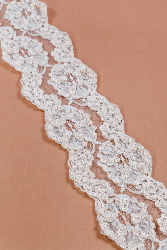 Italiensk sybehörstejp - spets 13 cm bred. Ett blommigt motiv dekorerat med ett snöre i form av "virvlar" i krämfärg. Tejpen avslutas på båda sidor med en tand.