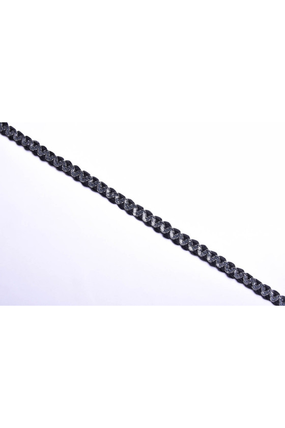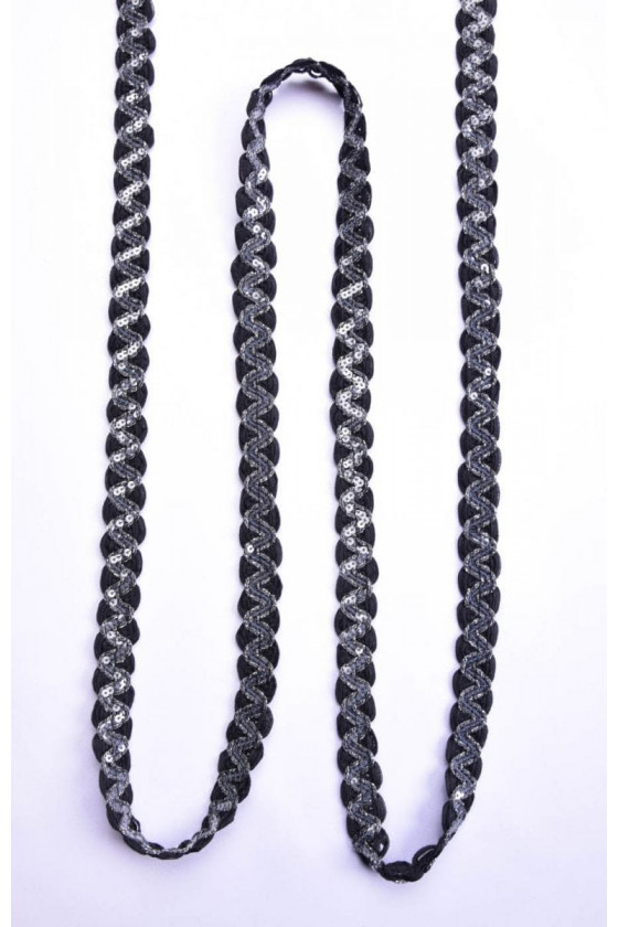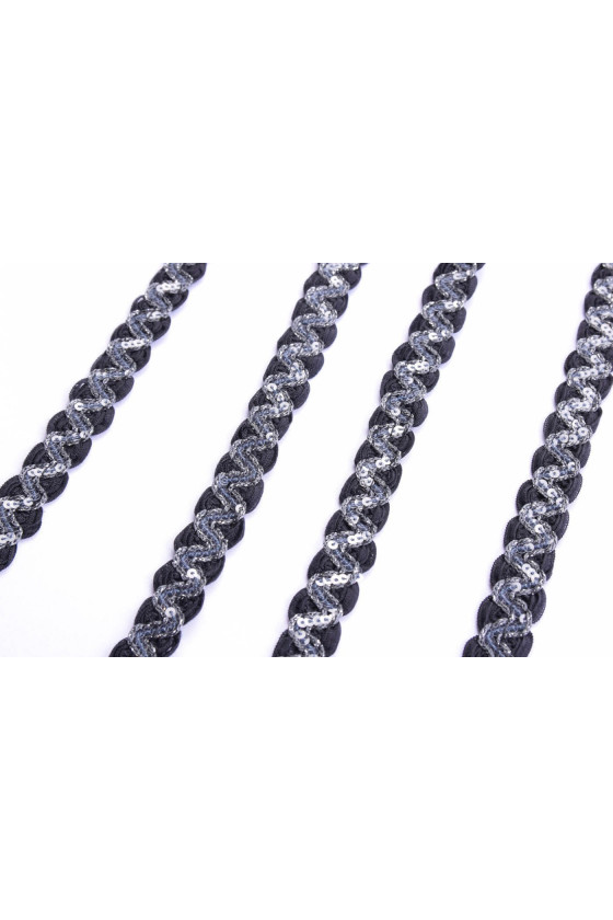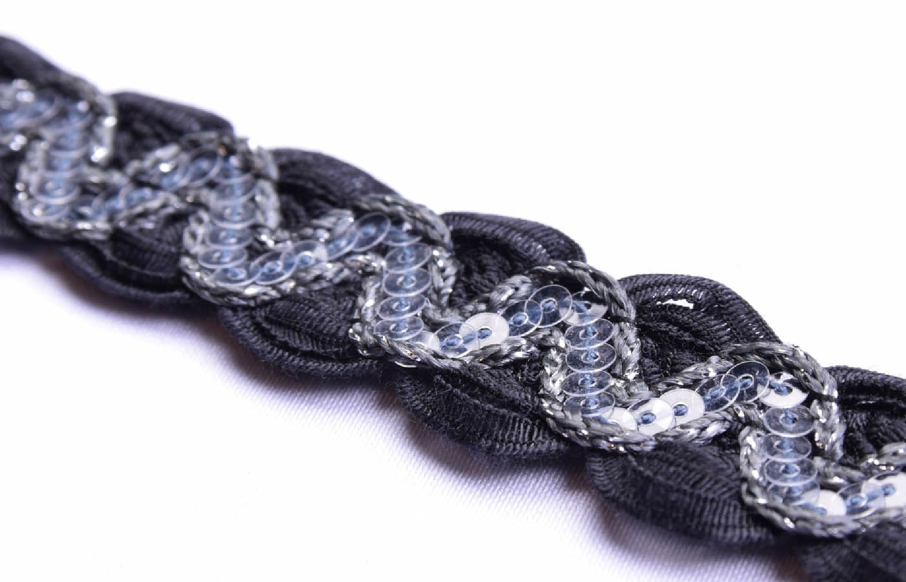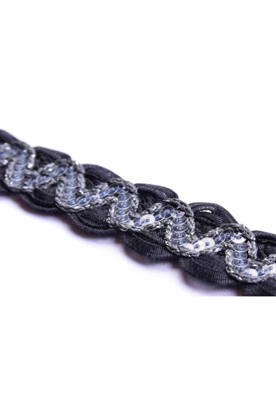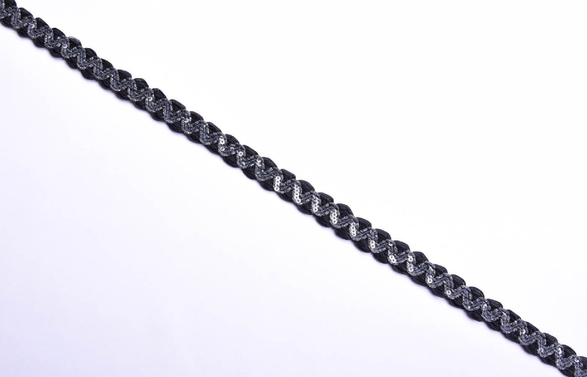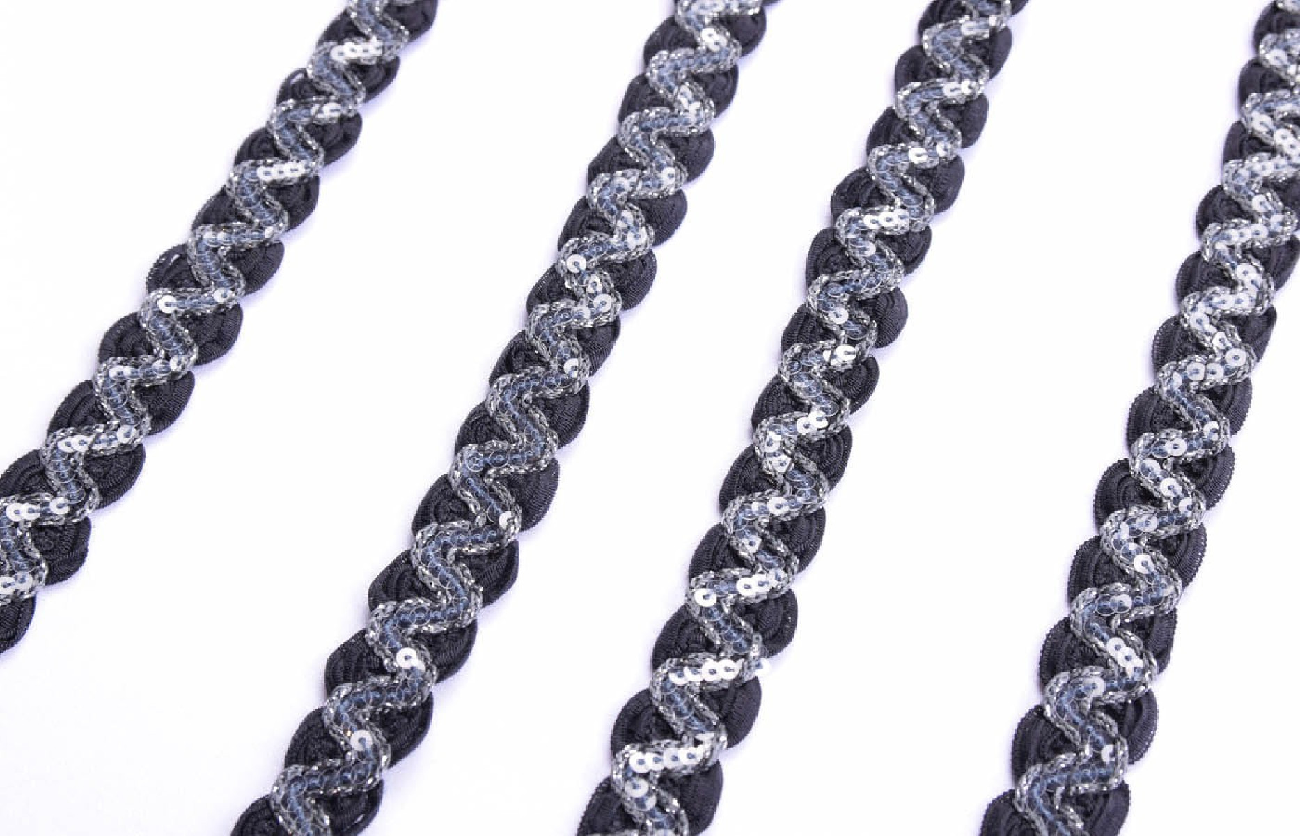 Vacker sybehörstejp med paljetter - grå sicksack med genomskinliga paljetter på svart bakgrund. Icke-elastisk tejp. Perfekt för ytbehandlingar och tillbehör, insatser.