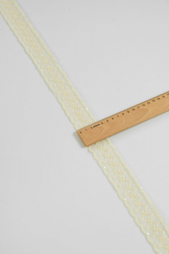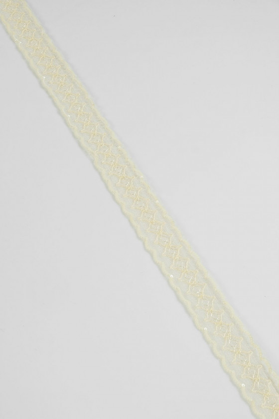 Paljetter och pärlor har broderats på tyllen. Tejpen är ca 4 cm bred. Perfekt för efterbehandling av klänningar, kjolar eller blusar.
