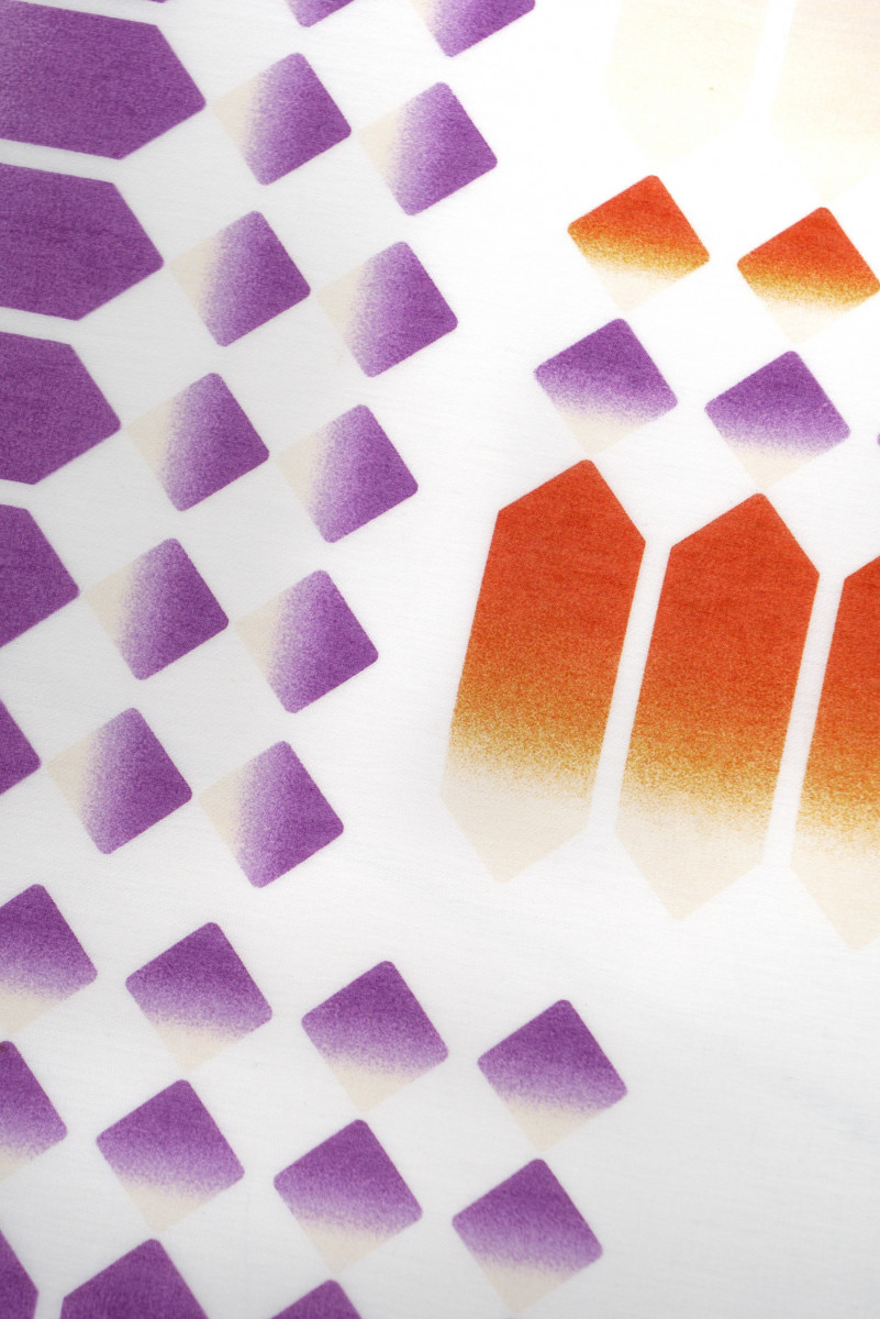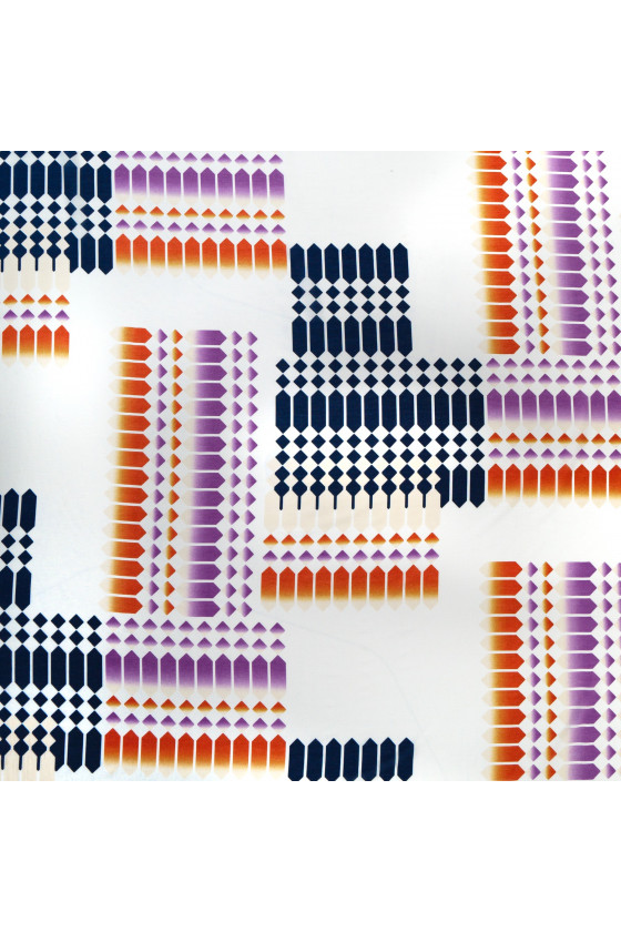 Italienskt siden- och bomullsbatisttyg med färgglada, geometriska mönster på en krämfärgad bakgrund.