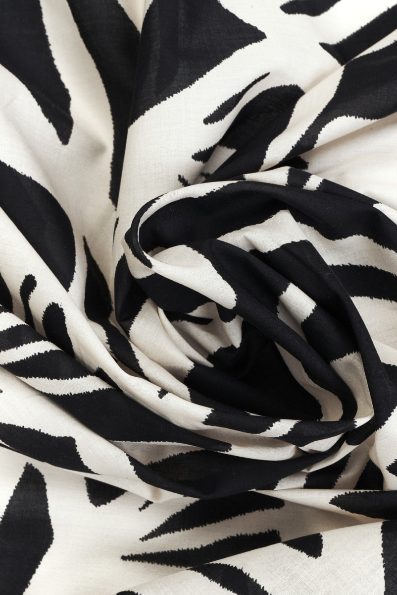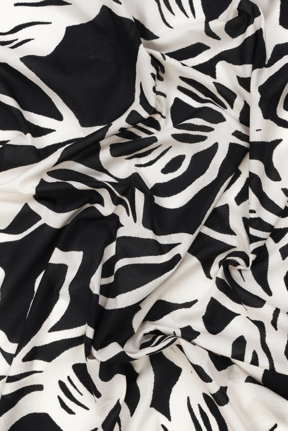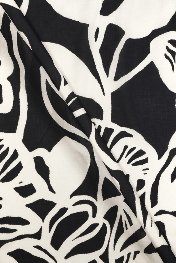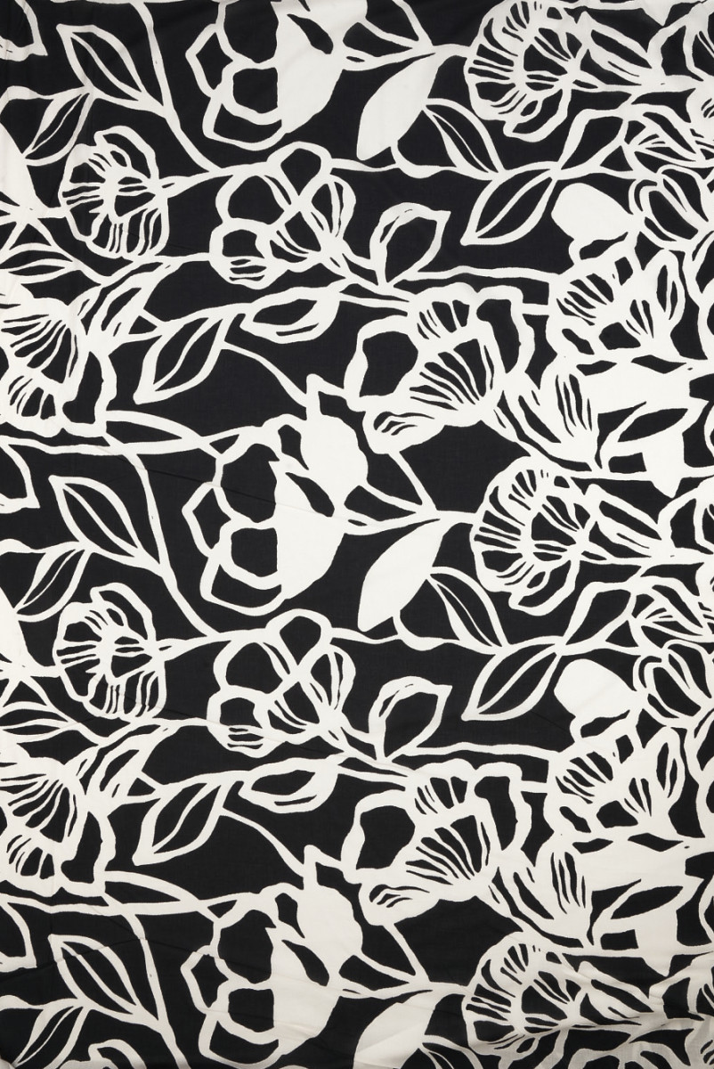 Italienskt tyg i 100% bomull med ett motiv av mycket stora blommor gjorda i ecru på en svart bakgrund. Blommiga mönster, som ligger ganska tätt i form av konturer av blomknoppar, stjälkar och blad, där enskilda blommor är från 21 cm till 35 cm stora. På grund av mönstrets position rekommenderar vi suturering runt om. Ett tyg med en slät väv, tunn, lätt transparent, luftig och icke-elastisk. Den är perfekt för långa klänningar och kjolar, såväl som blusar, T-shirts och skjortor.