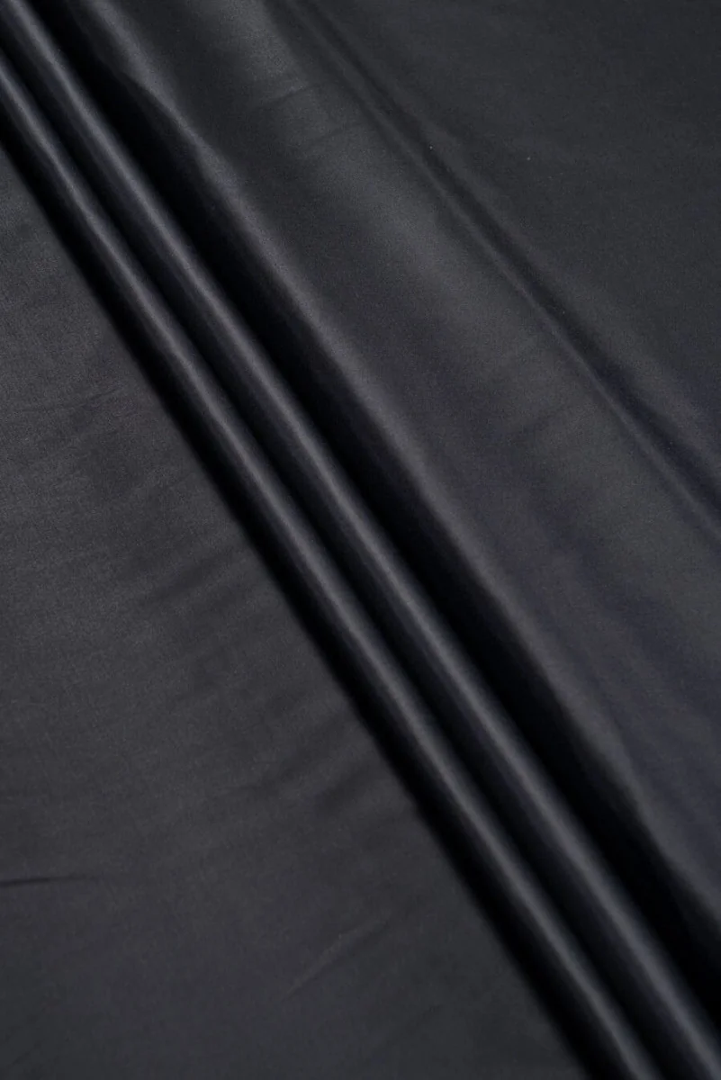 Italienskt siden- och bomullstyg i mörkblått blått lite. Tyginslaget är gjort av bomull och varpen är gjord av silkestråd. Tyget är oelastiskt, med en slät, glänsande satinväv, varsamt styvt arrangerat – perfekt för att sy en kjol eller klänning.