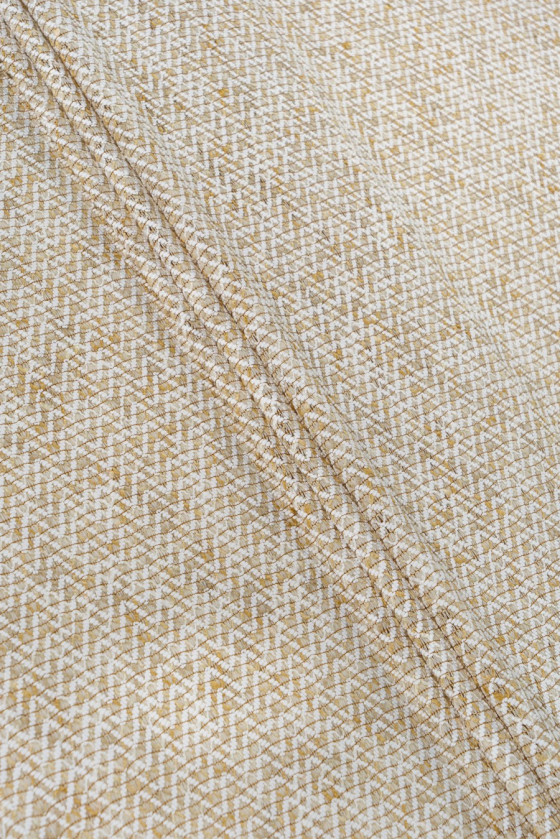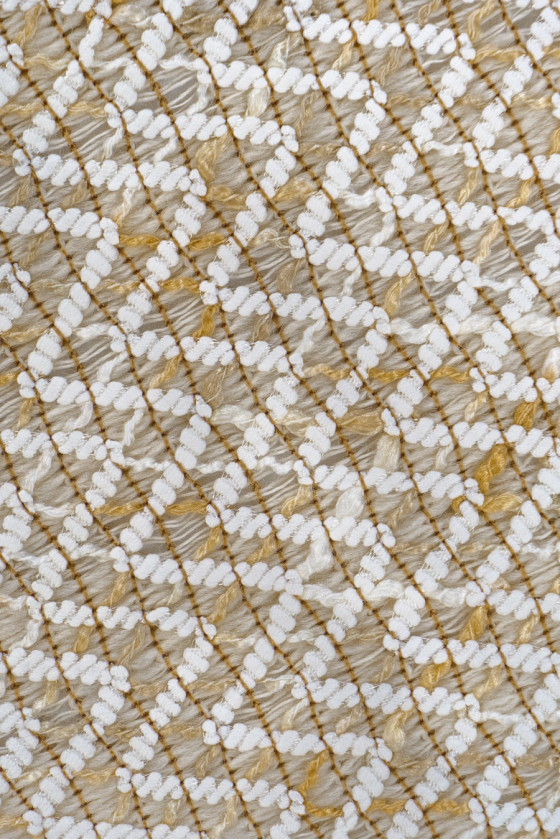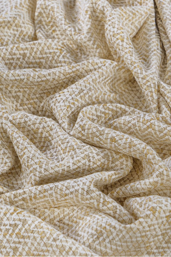 Original chaneltyg, löst vävt på en ullvarp (ecru och beige färg) i ett sicksackmönster - viskostråd med delikat, gyllene lurex. Helheten skapar en unik effekt! Vi rekommenderar den för att sy vårjackor, koftor, tunna kappor eller som ett dekorativt tyg.
