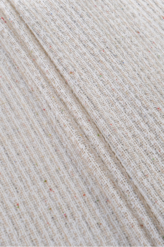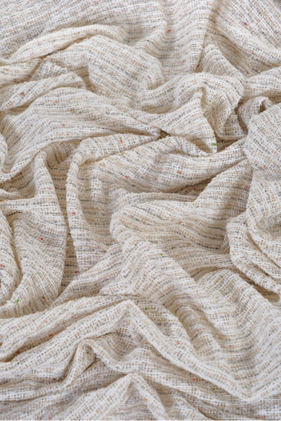 Ett klänningstyg med lös väv som ett nät avsett för vårklänningar i färgerna creme, mycket ljusbeige med fina, färgglada accenter. Tyget är vävt av viskos och polyamid och behöver fodras med foder.