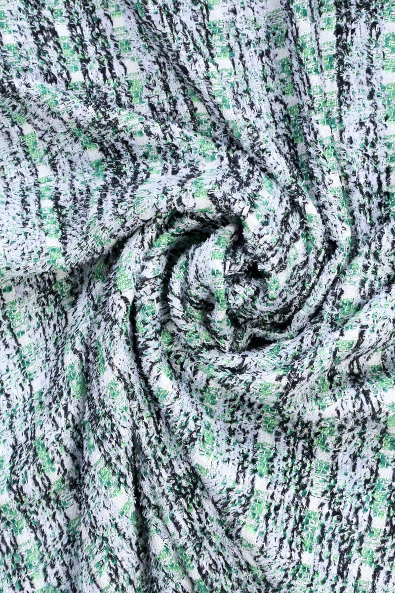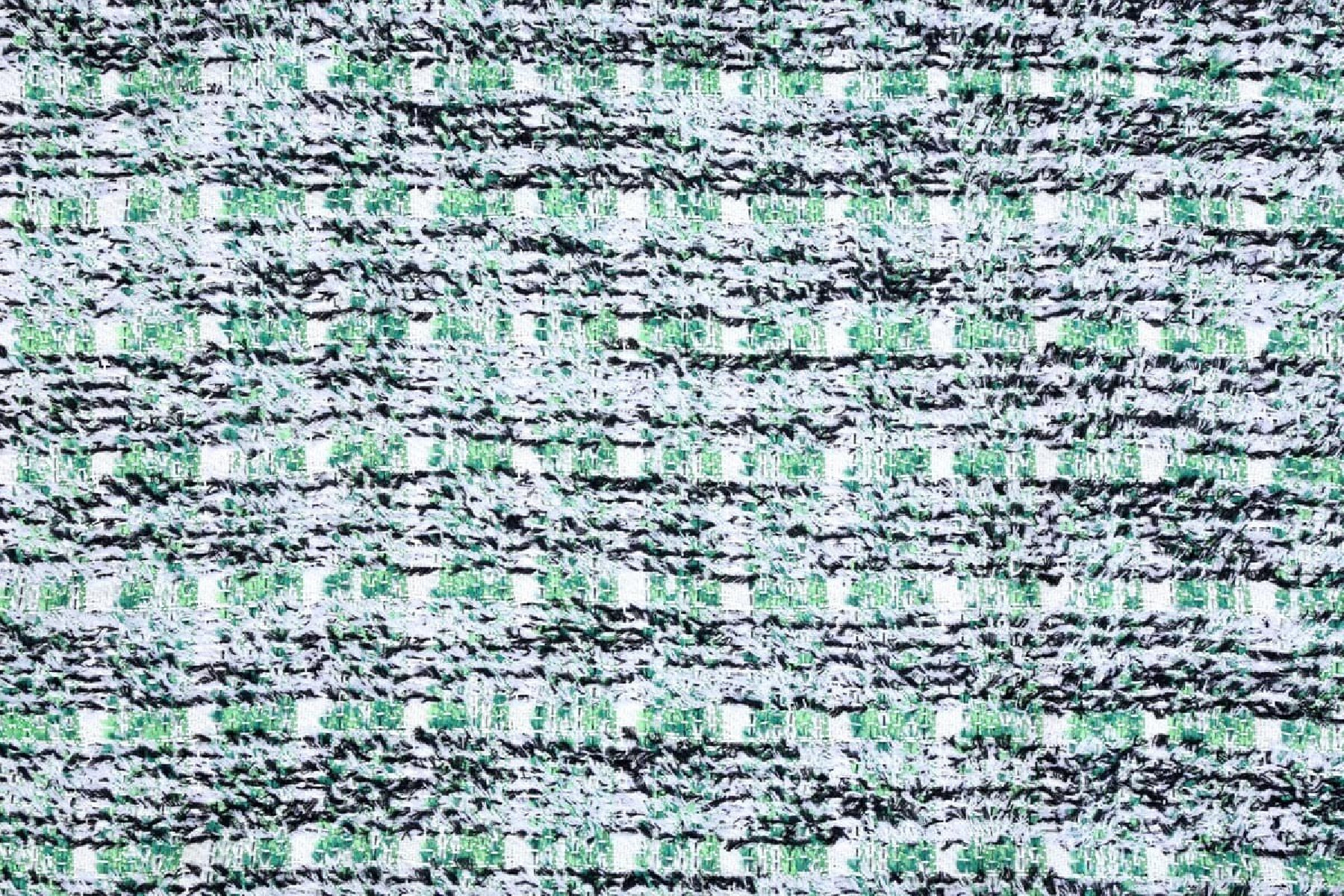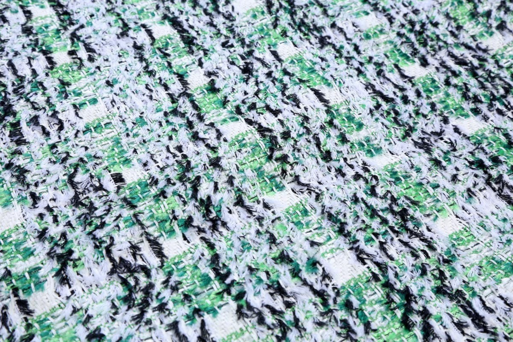 Original chanel kostymtyg i vitt, svart och grönt check för eleganta uppsättningar - jackor med kjolar och klänningar. Tyget är vävt med naturfibrer, ull och viskos, vilket garanterar komfort att bära. Vi rekommenderar att du väljer ett foder som du hittar i vår butik. Materialet är inte elastiskt.