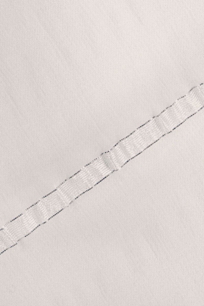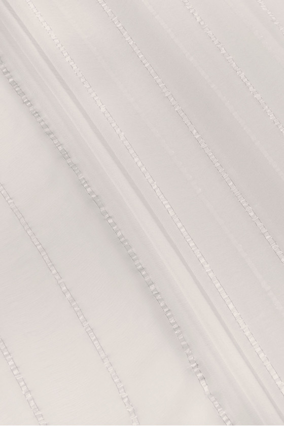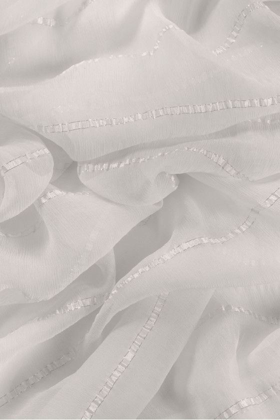 Chiffong i naturligt siden skrynklad med lurex är ett mycket känsligt, luftigt och transparent tyg. Perfekt för eleganta luftiga klänningar och blusar. Elastiskt tyg - fungerar på trådar. Färger: ecru, var 7:e cm en diskret rand med silverlurextråd.