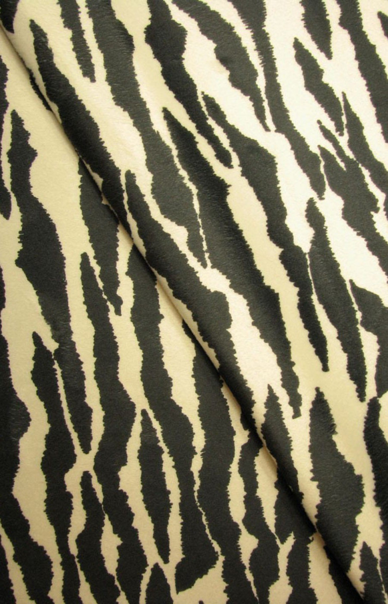 En miljövänlig päls med zebramönster och små hårstrån. Ljusbeige och svart färg. Den kan användas för att sy kappor, jackor eller som tyg för inredning.
