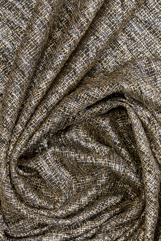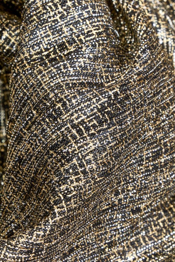 Ett imponerande finplisserat tyg i guld och svart med en glänsande lurextråd invävd i den.