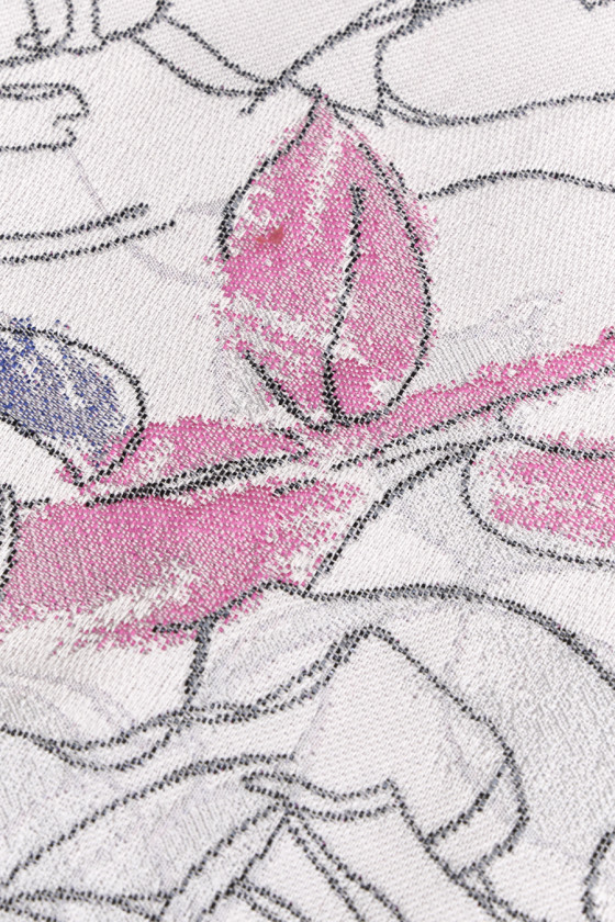 Italiensk jacquardkostym i ljusgrått. Materialet har ett mycket originellt mönster av skissade rosblommor, skissen är gjord av grå glänsande tråd, vilket ger den elegans. Några av blommorna har lila fyllning, dessutom är bladen färgade rosa, lila och marinblå. Den vänstra sidan av tyget är också mycket effektiv och kan användas. Materialet har en tät väv, är oelastiskt och styvt. Ett bra förslag för att sy en kostym, klänning, kjol eller för dekorativa ändamål.