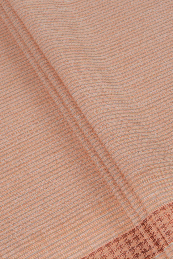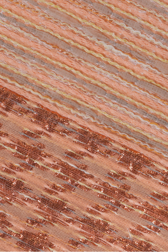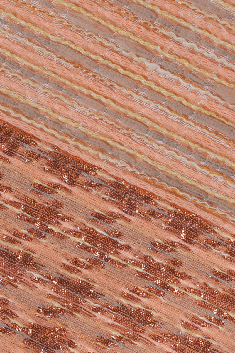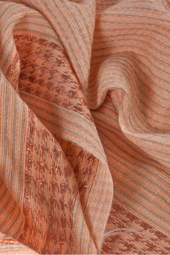 Italiensk jacquard kostymtyg i kupongstorlek 80cm * 145cm. Ett intressant motiv med små, horisontella ränder i grå-laxfärg. Kupongen är färdig med en dekorativ 7 cm bred ram och är dessutom dekorerad med en glänsande koppartråd, vilket ger den elegans. Tyget är tjockare, något styvt med en konvex väv - perfekt för att sy en kjol, kostym, klänning.