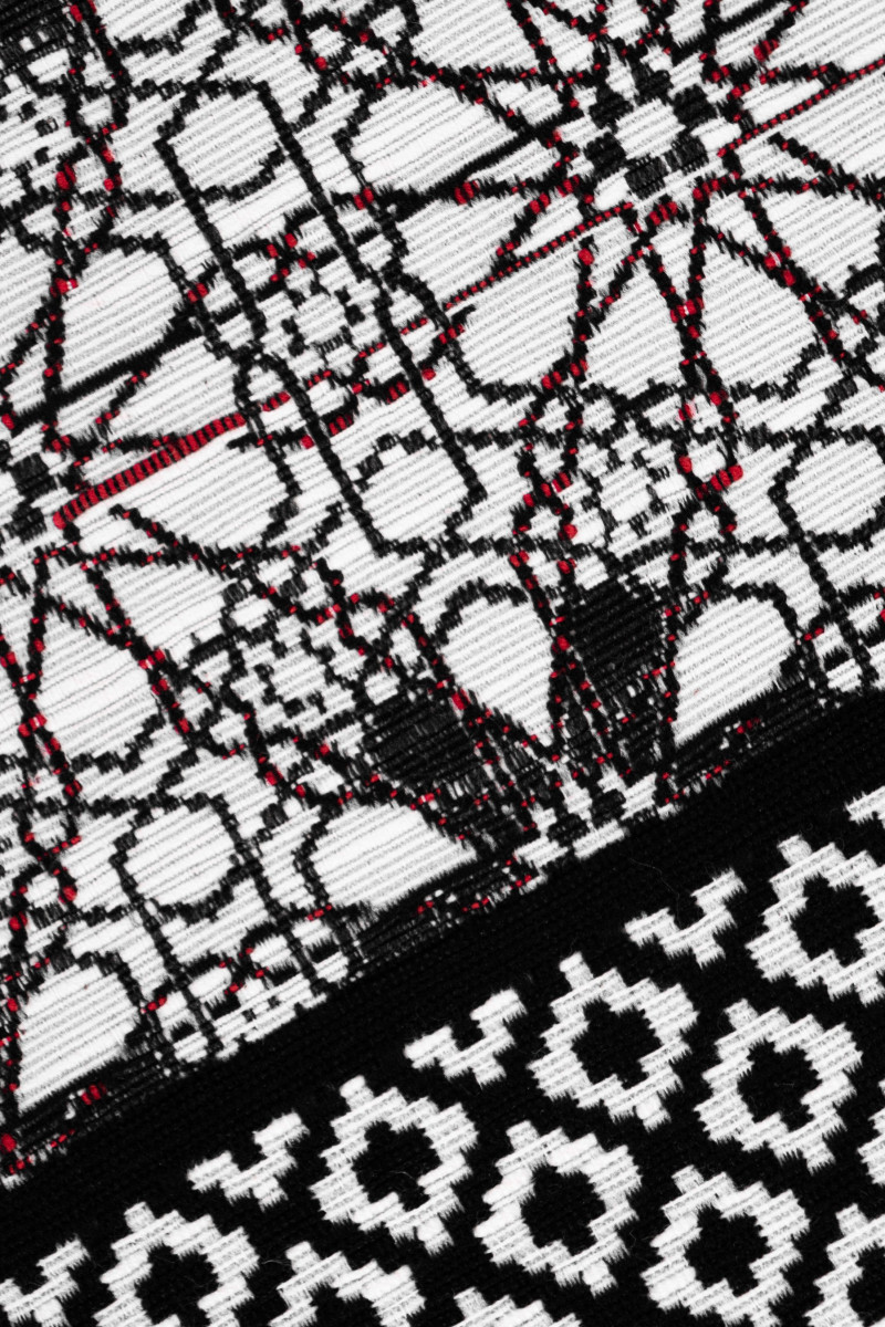 Italiensk jacquarddräkt tyg i kupongstorlek 50cm * 150cm. Tyg med ett litet diamantmotiv i vitt och svart avslutat med en dekorativ 17 cm bred rand i vinrött med ett blommönster.