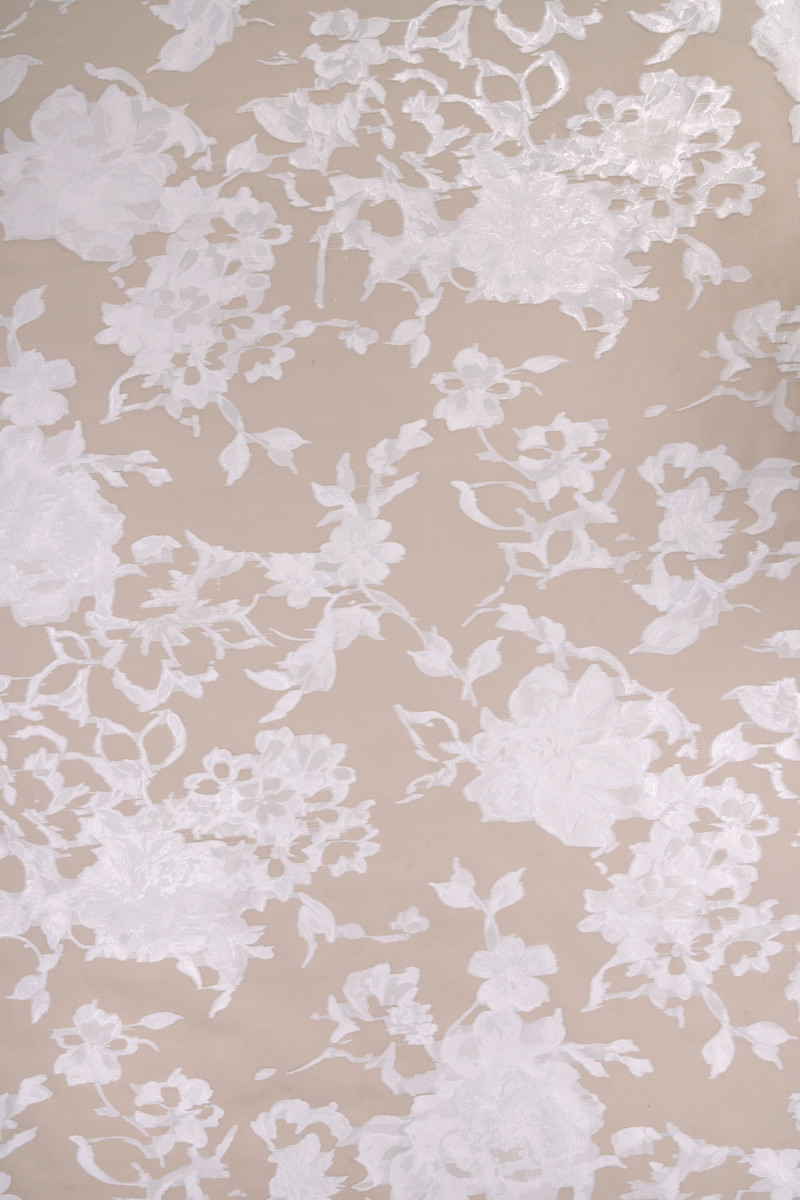Italienskt organzatyg i mintfärg med ett motiv av gräddsilver, jacquardblommor, dekorerat med glänsande tråd.