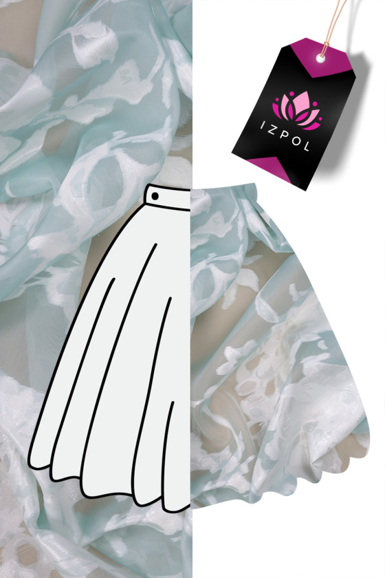 Italienskt organzatyg i mintfärg med ett motiv av gräddsilver, jacquardblommor, dekorerat med glänsande tråd. Tyget är tunt, transparent, icke-elastiskt, något styvt. Perfekt för att sy en klänning eller kjol.