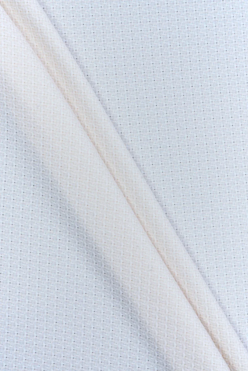 Krämfärgat jacquardtyg med en vävd delikat silver- och ljusbeige tråd som ger hela ytan ett svagt laxfärgat sken. Regelbunden flätning skapar en märkbar och synlig struktur av små ben. Tyget är oelastiskt, mjukt, lite blankt och tunt, men täcker ganska bra. Materialet ser subtilt och fräscht ut, det kommer att passa perfekt till vår- och sommaroutfits som klänningar, kostymer och kjolar.