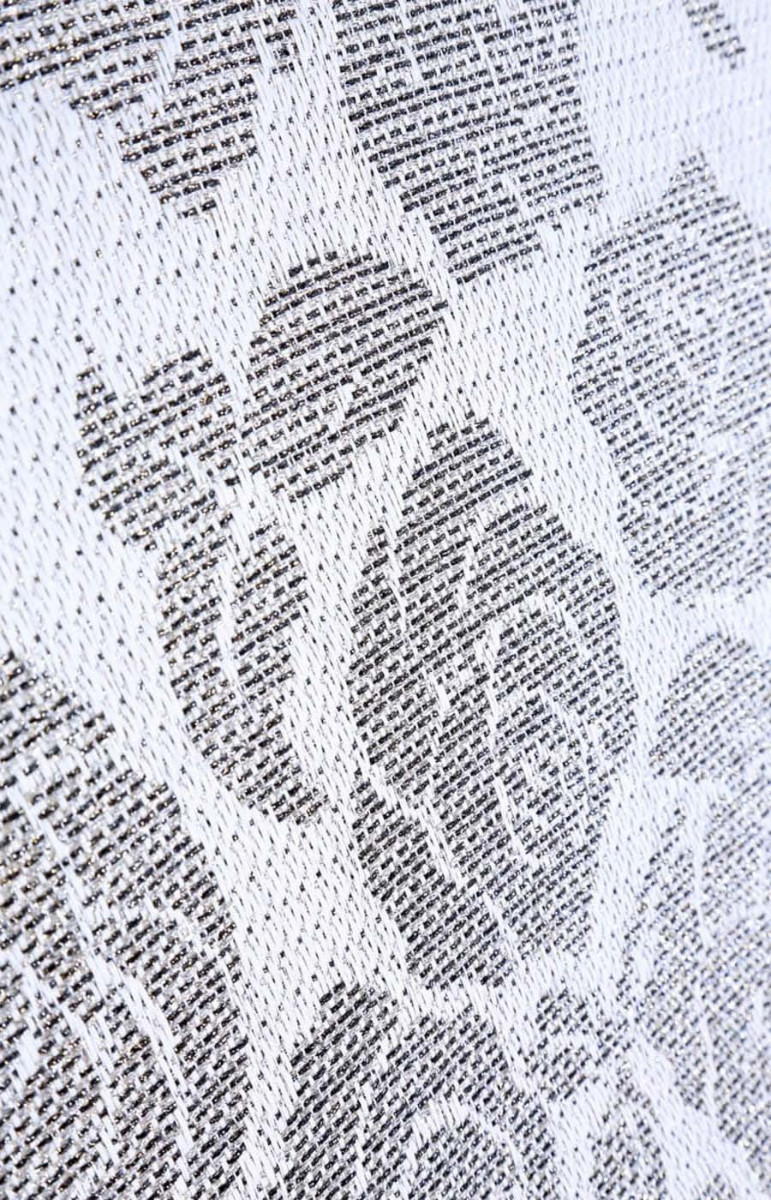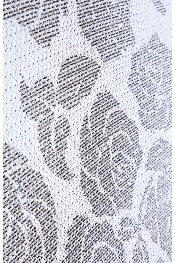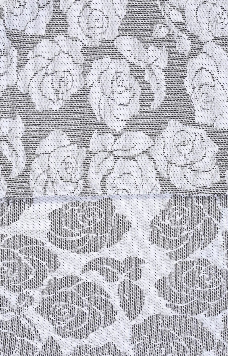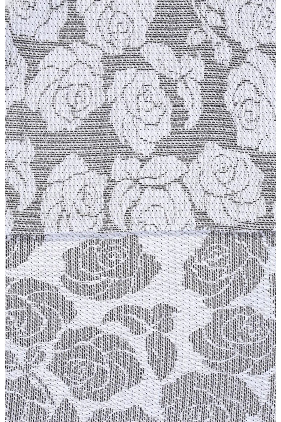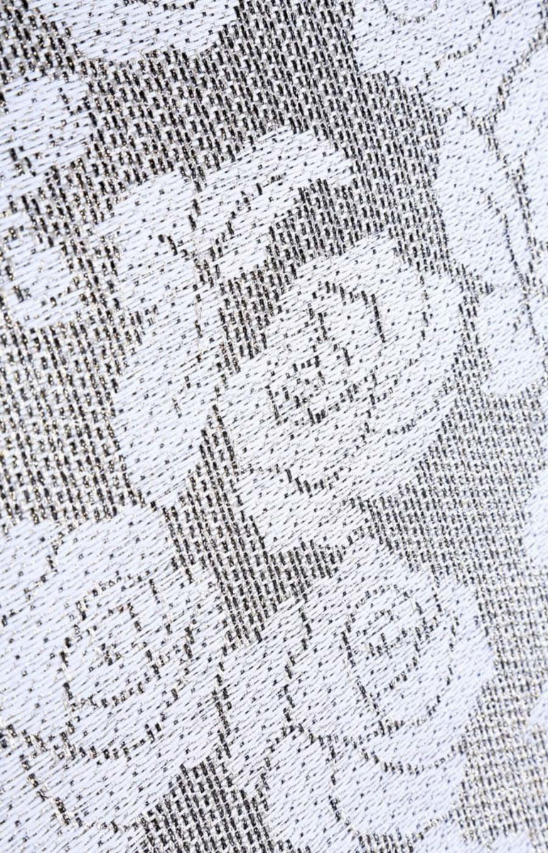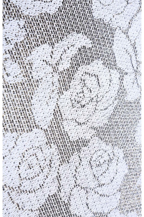 Jacquardtyg vävt av en blandning av bomull, viskos och polyamid med ett tätt rosblomsmotiv. Det är mjukt, oelastiskt och mycket effektivt. Tyget har en något lös väv och avslutas med en silvertråd. Ett bra förslag för kostymer, klänningar eller jackor.