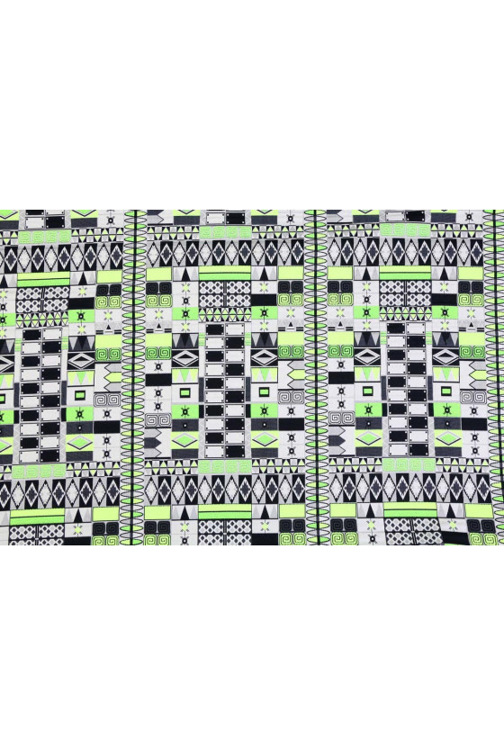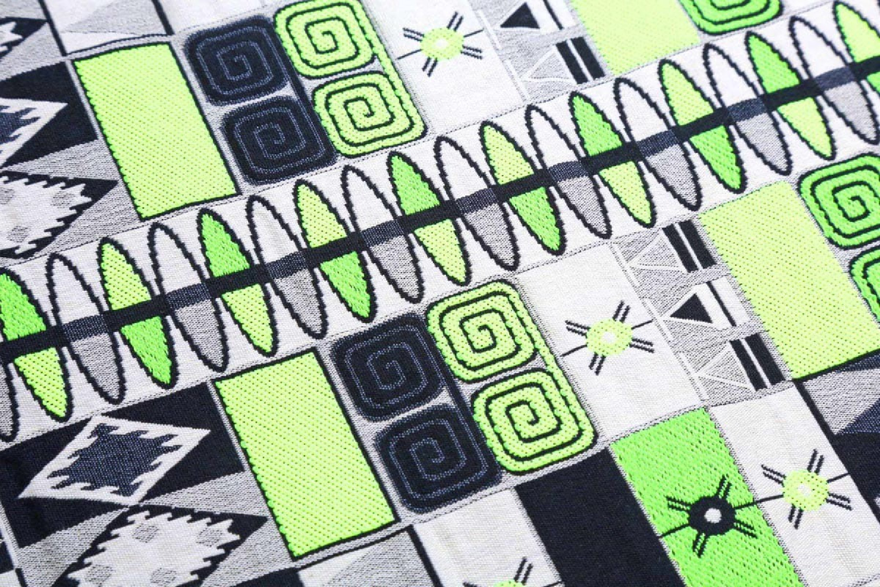 Jacquard med geometriskt mönster är ett icke-elastiskt tyg avsett för klänningar eller kostymer. Gröna element har en mycket intensiv färg. Du kan också sy ett tunt lager.