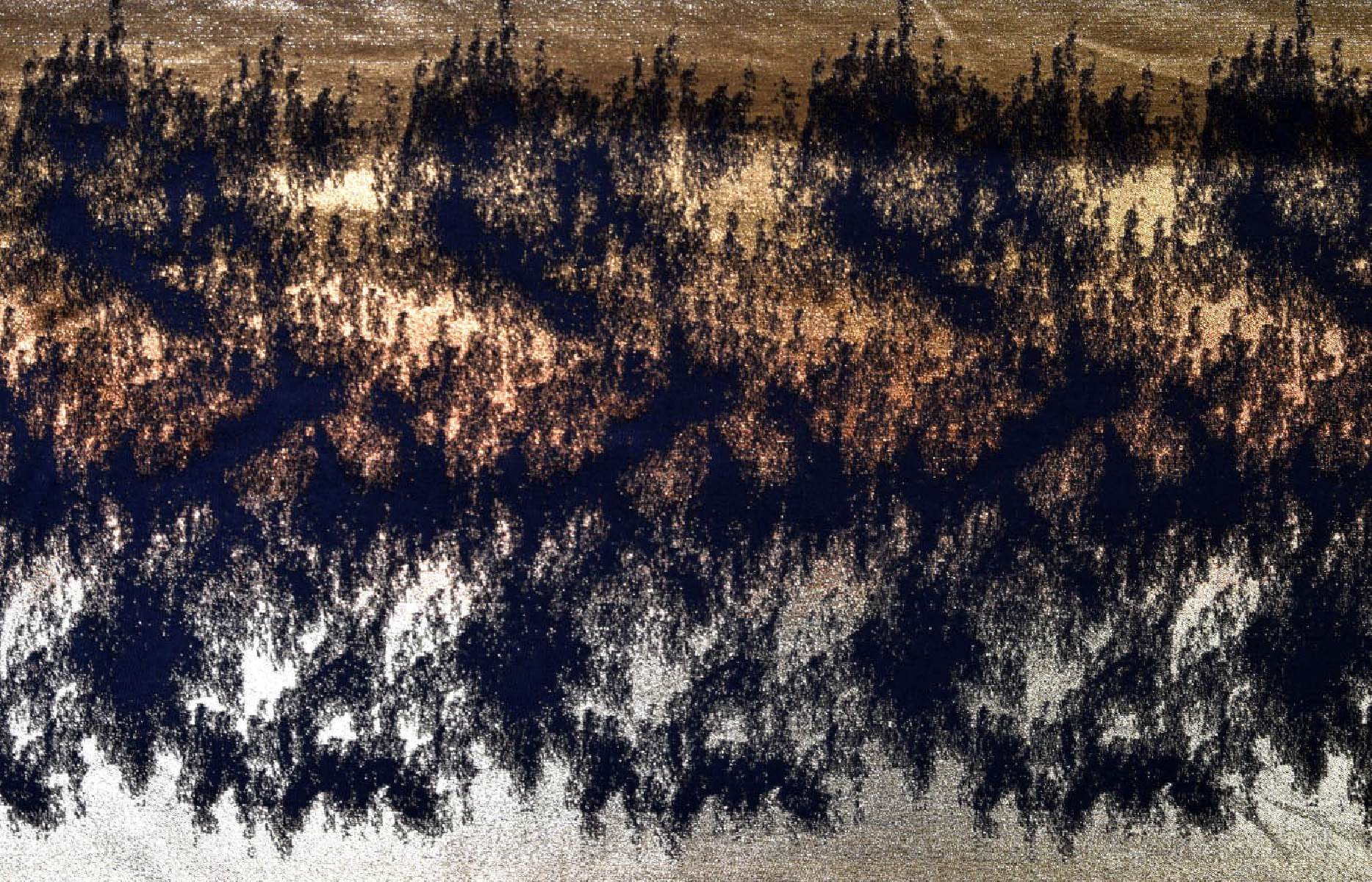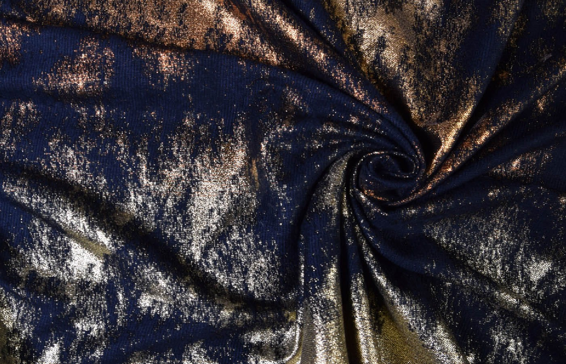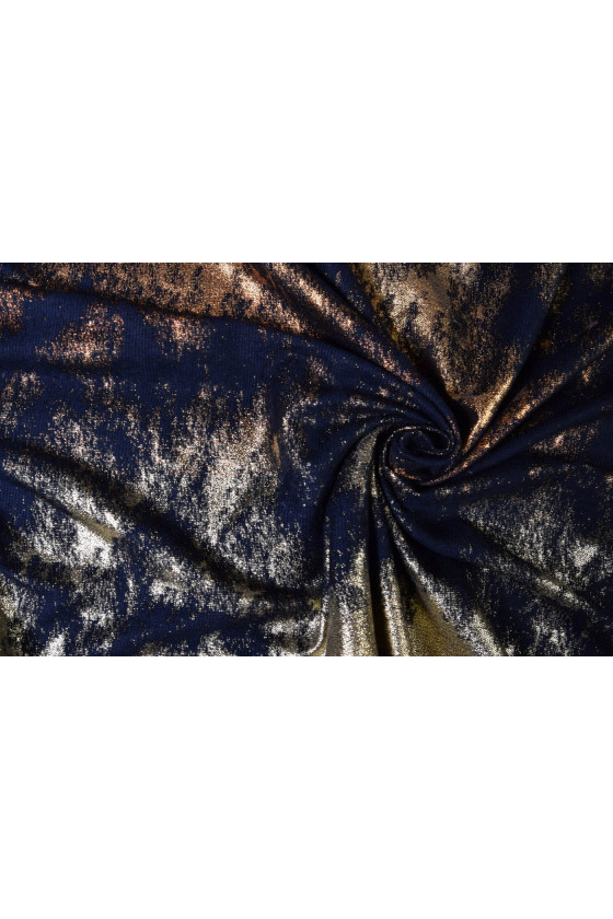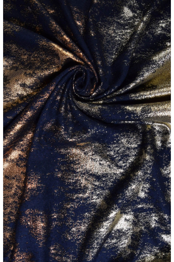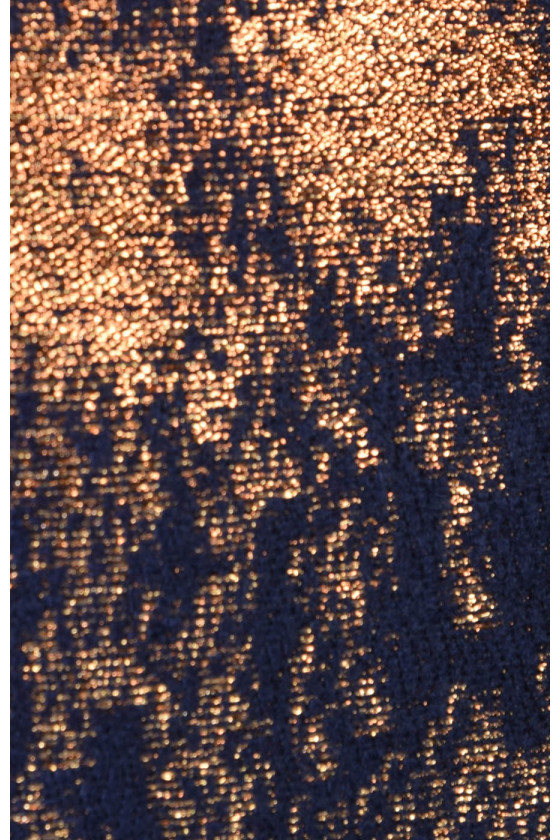 Den sista kupongen av italienskt jacquardvävt tyg. Ett oregelbundet mönster av silver och kopparmetalliserad fiber dekorerar vackert den mörkblå bakgrunden. Tyget är mjukt och behagligt, "varmt" vid beröring. Med denna kupong syr du en mycket original kjol. I kombination med ett annat tyg kan det skapa en grund för att sy en vacker jacka eller tröja, samt en dekoration, t.ex. en kudde.