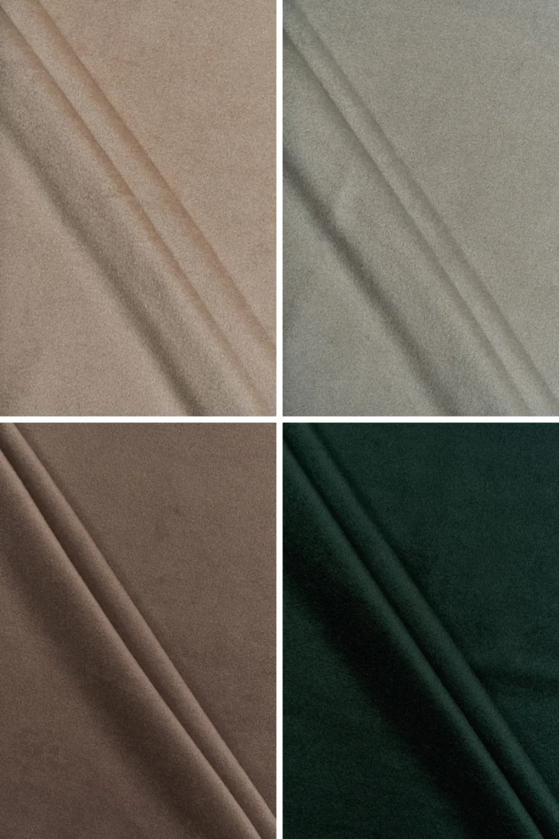 Italienskt kapptyg i en vacker och moderiktig färgpalett gjord av naturlig ull. Tyget är mjukt, har en delikat och mycket kort lugg. Den är idealisk för ytterkläder (kappa, jacka, väst) eftersom den värmer och samtidigt låter huden andas. Kemtvätt rekommenderas.