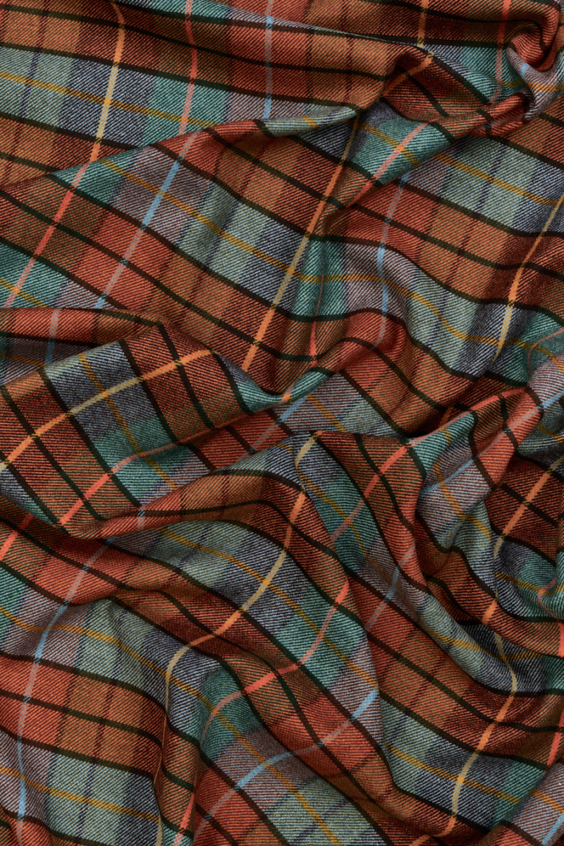 Italienskt kostymtyg från höst/vinterkollektionen, vävt av ull och polyester med ett rutigt motiv i orange, blått och salvia. Ett regelbundet mönster bestående av rutor placerade bredvid varandra med en storlek på 2 cm * 2 cm. Tyget är medeltjockt, mjukt, behagligt att ta på och flexibelt. Den är gjord i en delikat kypertväv. Ett tidlöst förslag som kommer att vara perfekt för att sy en kjol, klänning, samt byxor och en jacka.