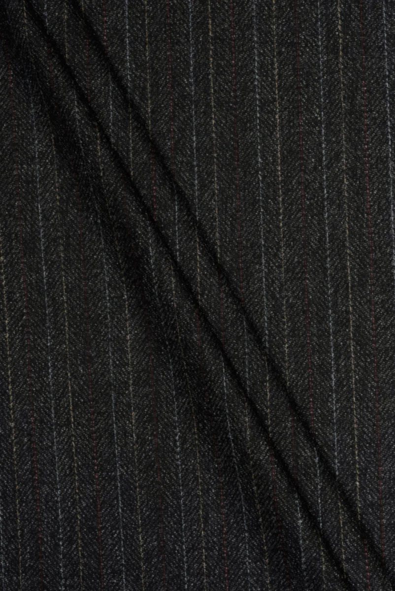 Italienskt ulltyg med tillägg av elastan i grafitmelangefärg med randigt motiv. Regelbundna ränder som växlar i rött, blått och gult på avstånd mellan 1 cm och 1,3 cm. Ränderna är placerade längs hela tygets längd. Materialet är medeltjockt, flexibelt, matt och mjukt lagd. Perfekt för klassiska kläder som kan användas för att sy jacka, byxor, kjol eller väst.