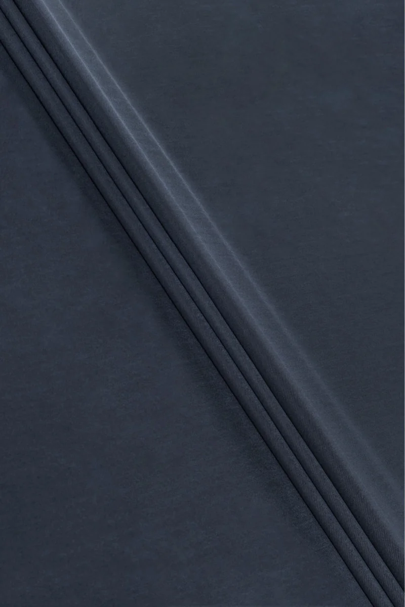 Italienskt dräkttyg gjort av naturlig vergan-ull med en blandning av siden. Materialet är vävt av två färger av marinblå och blå denimtrådar, vilket skapar en tvåfärgad effekt, dessutom har tyget ett pärlemorskimrande sken. Tyget är oelastiskt, av medeltjocklek med en väv som liknar en liten kub. Tillsatsen av siden ger den adel och en delikat glans. Den är perfekt för att sy en klassisk kostym, klänning, kjol eller byxor. Naturligt tyg i en originalfärg för dem som gillar intressanta färger.