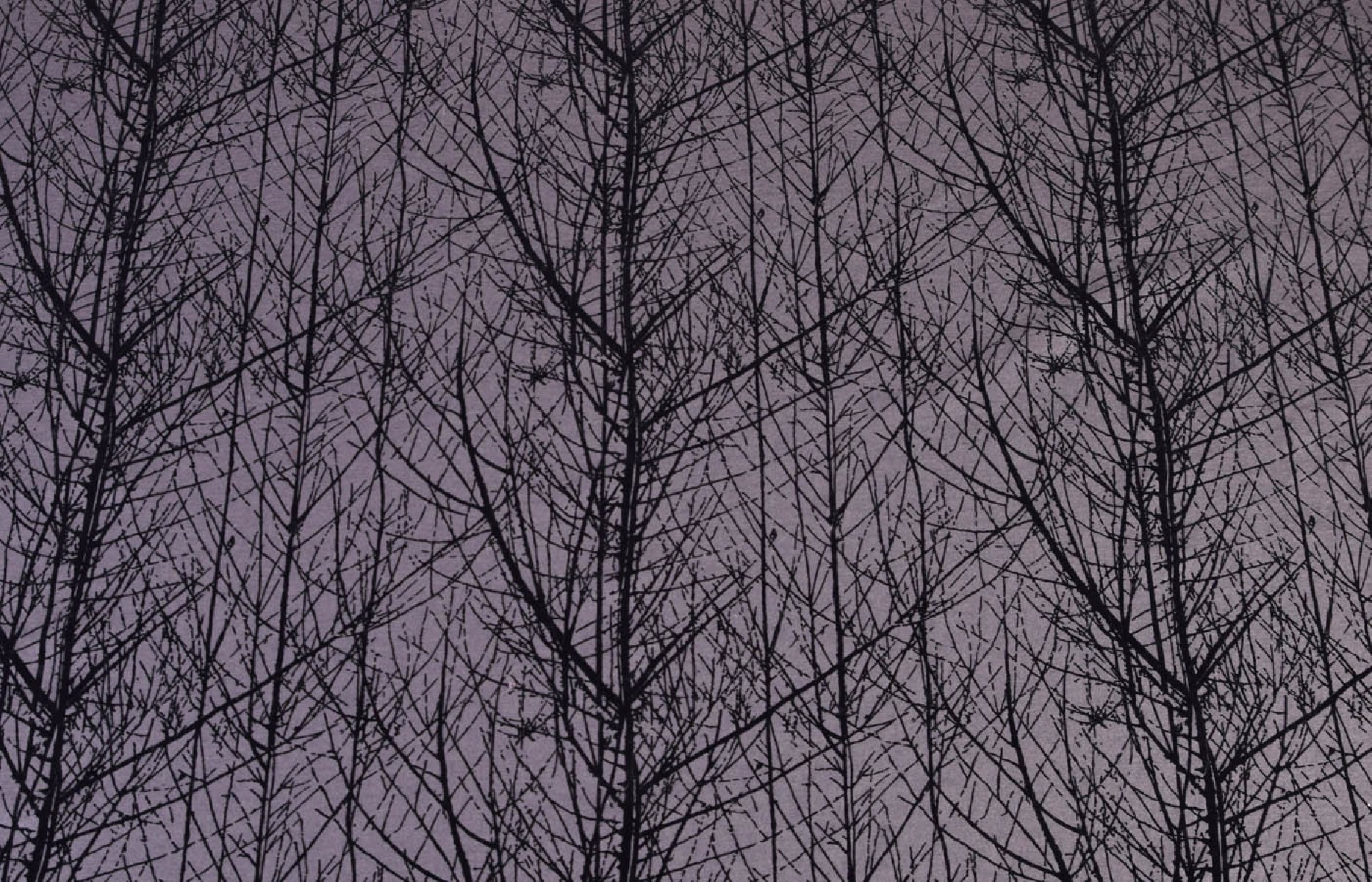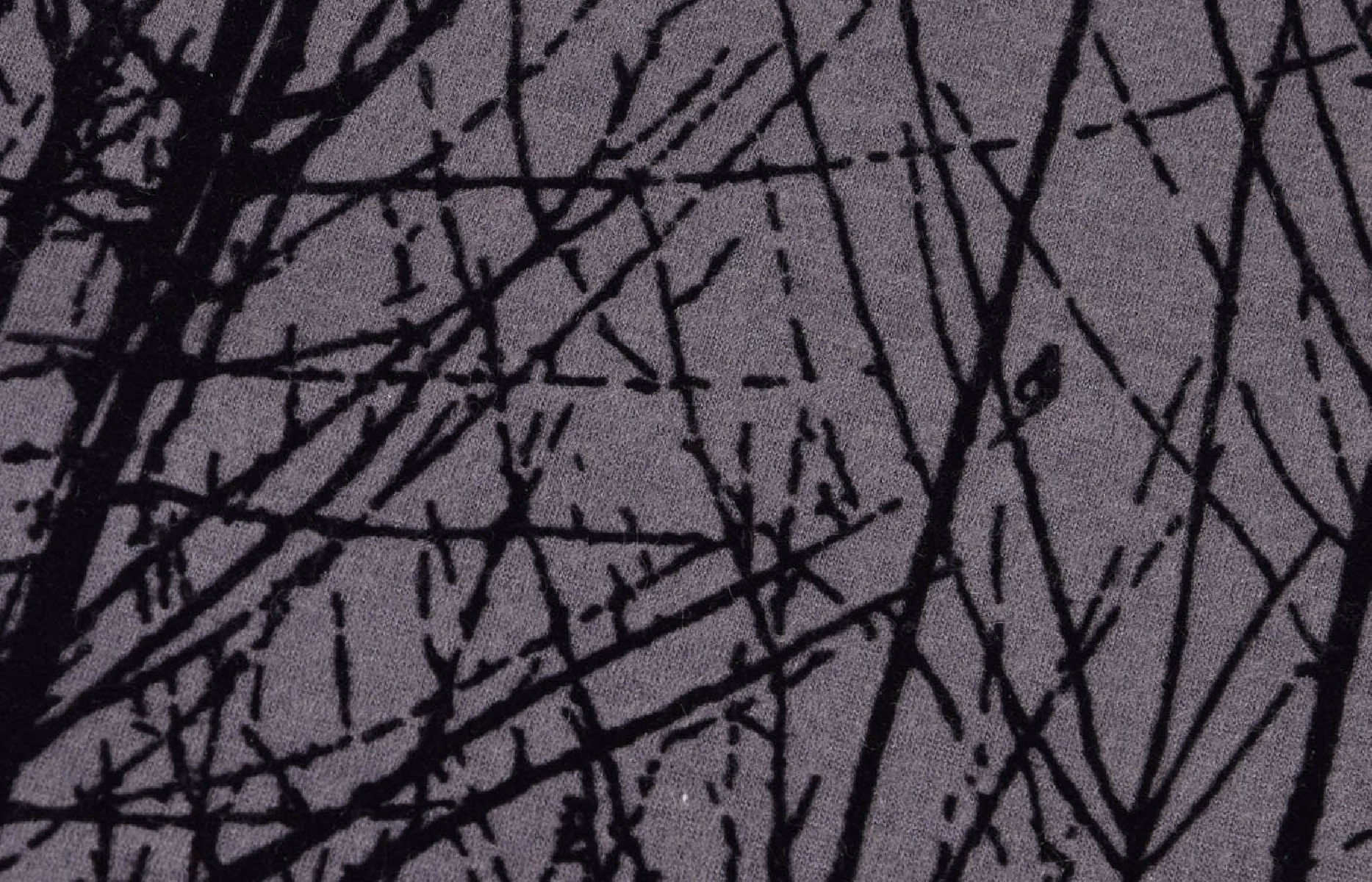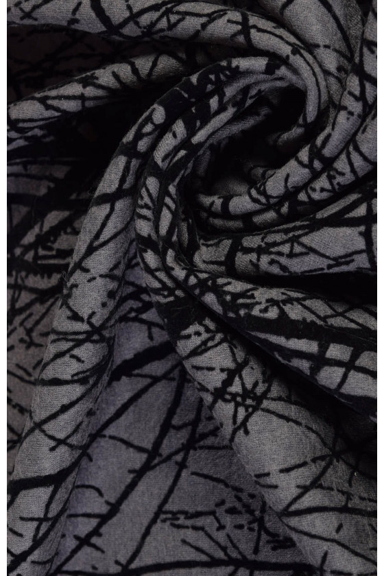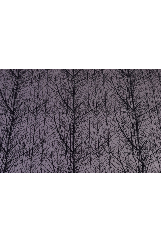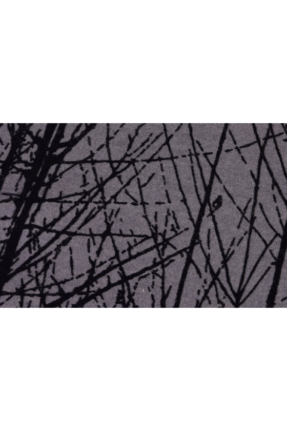 Ångad ull av medeltjocklek. Ett mönster av svarta träd appliceras på helheten. Tyget är perfekt för tunna kappor, klänningar, kjolar.