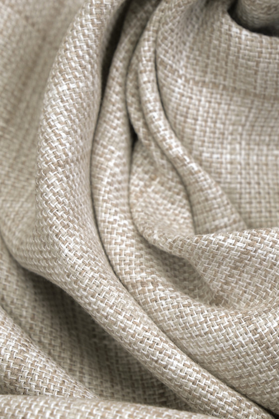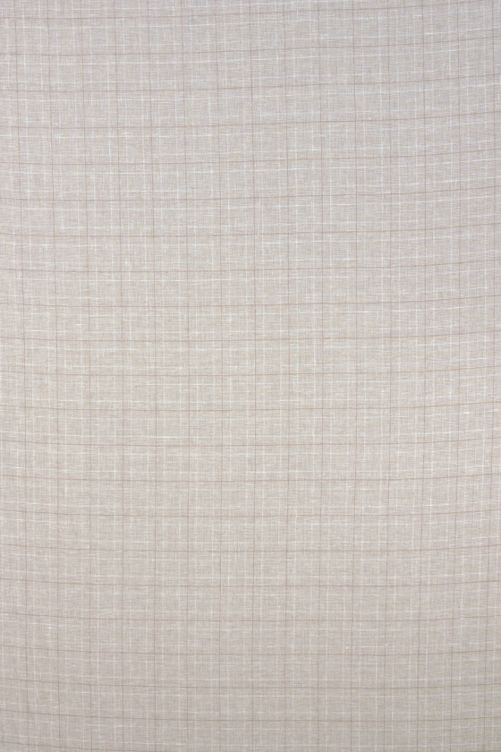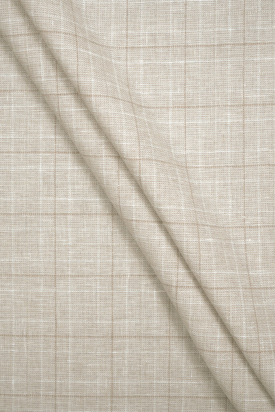 Italienskt tyg en blandning av linne, polyester, ull och viskos med ett delikat rutigt motiv i beige nyanser. Tyget är tunt, icke-elastiskt, med en något lös väv, men täcker bra. Ett klassiskt förslag för byxor, jackor, klänningar, kjolar och shorts.