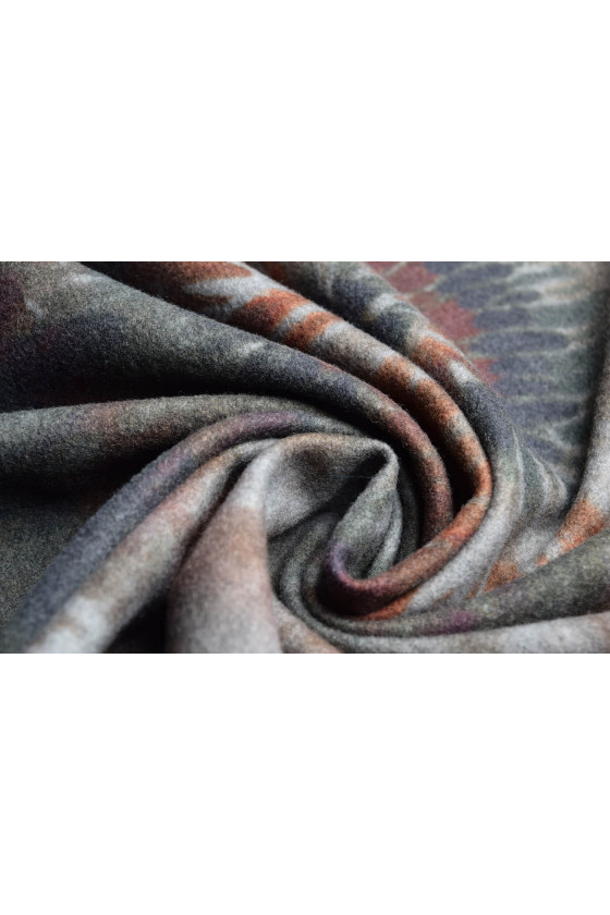 Ett intressant förslag på kapptyg. Den kommer i en rektangulär panel som mäter 150 cm * 140 cm. Kupongen har en orientalisk design. Tyget är tjockare, oelastiskt. Naturlig ull, kemtvätt rekommenderas. Perfekt för kappor, jackor.