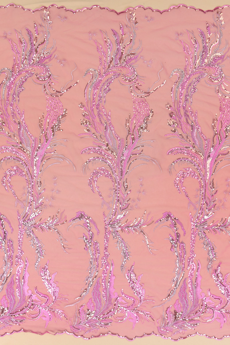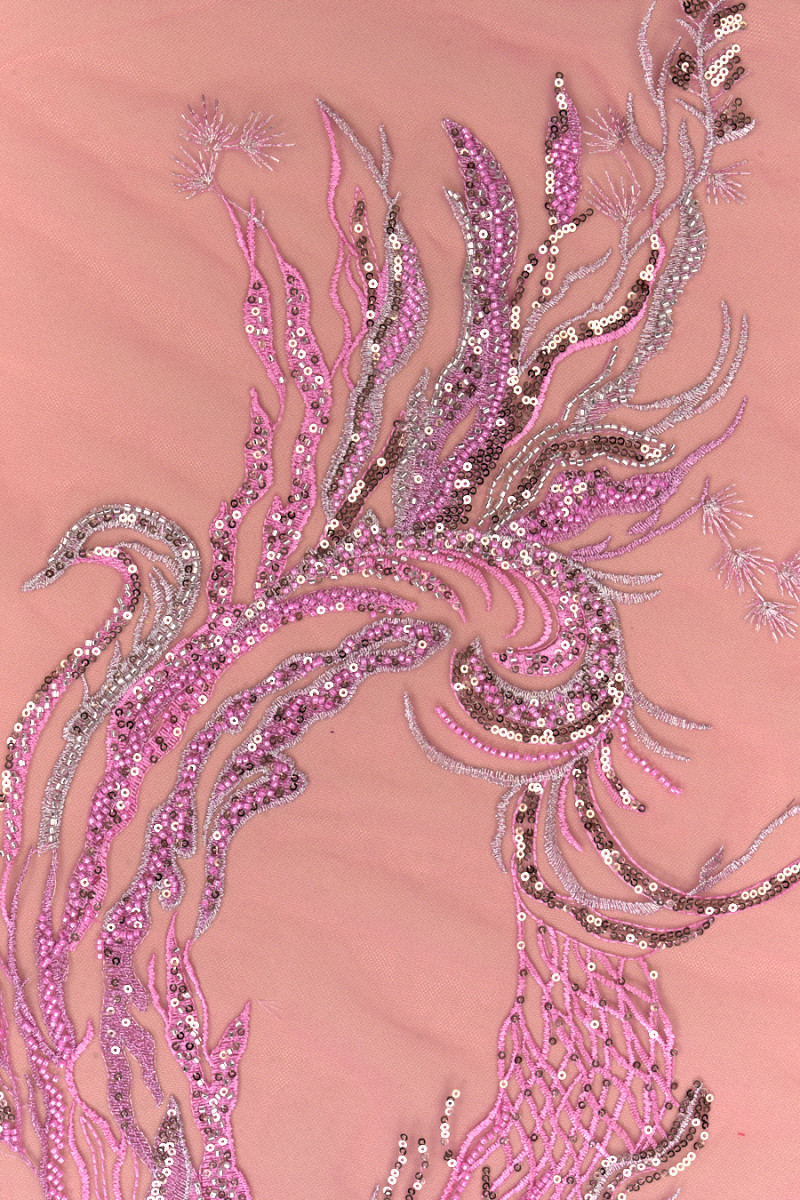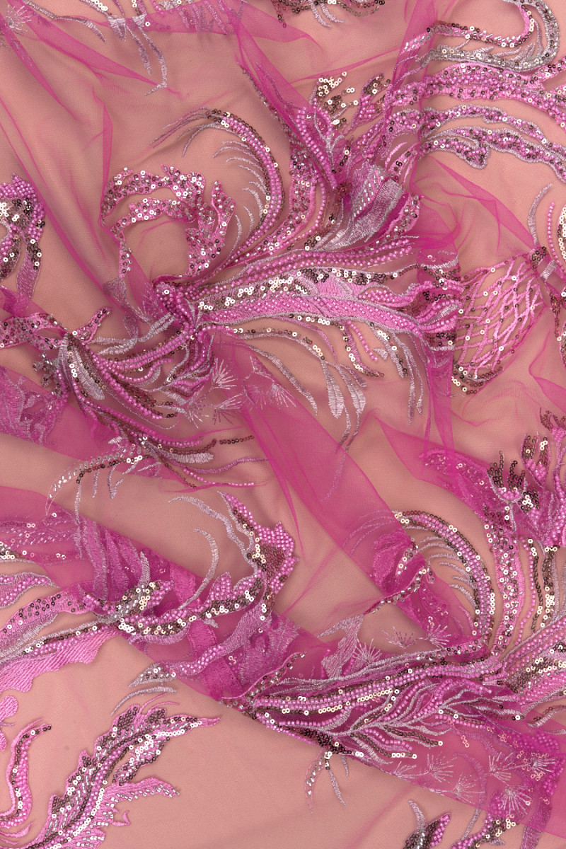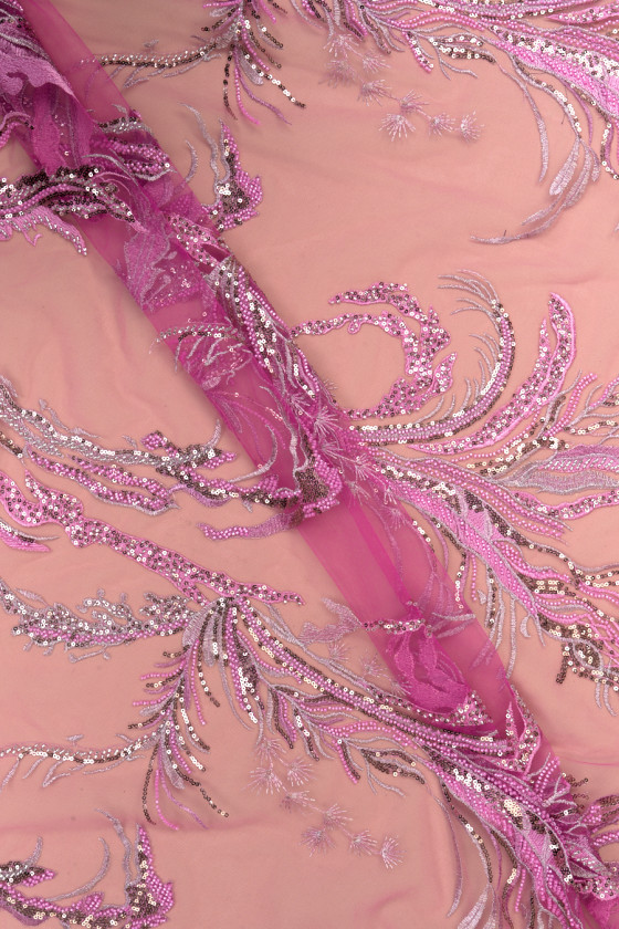 Italienskt aftontyg i rosa. Styv tyll i samma färg med rosa och silverbroderier, rikt dekorerad med guldpaljetter och små rosa och silverpärlor. De är arrangerade i ett snyggt mönster som tjocknar mot ena kanten - tyget sys runt omkretsen. Tyget avslutas med en dekorativ tand på båda sidor. Ett bra förslag i den mest fashionabla färgen för flera säsonger. Den är perfekt för att sy en elegant klänning, kjol eller blus.