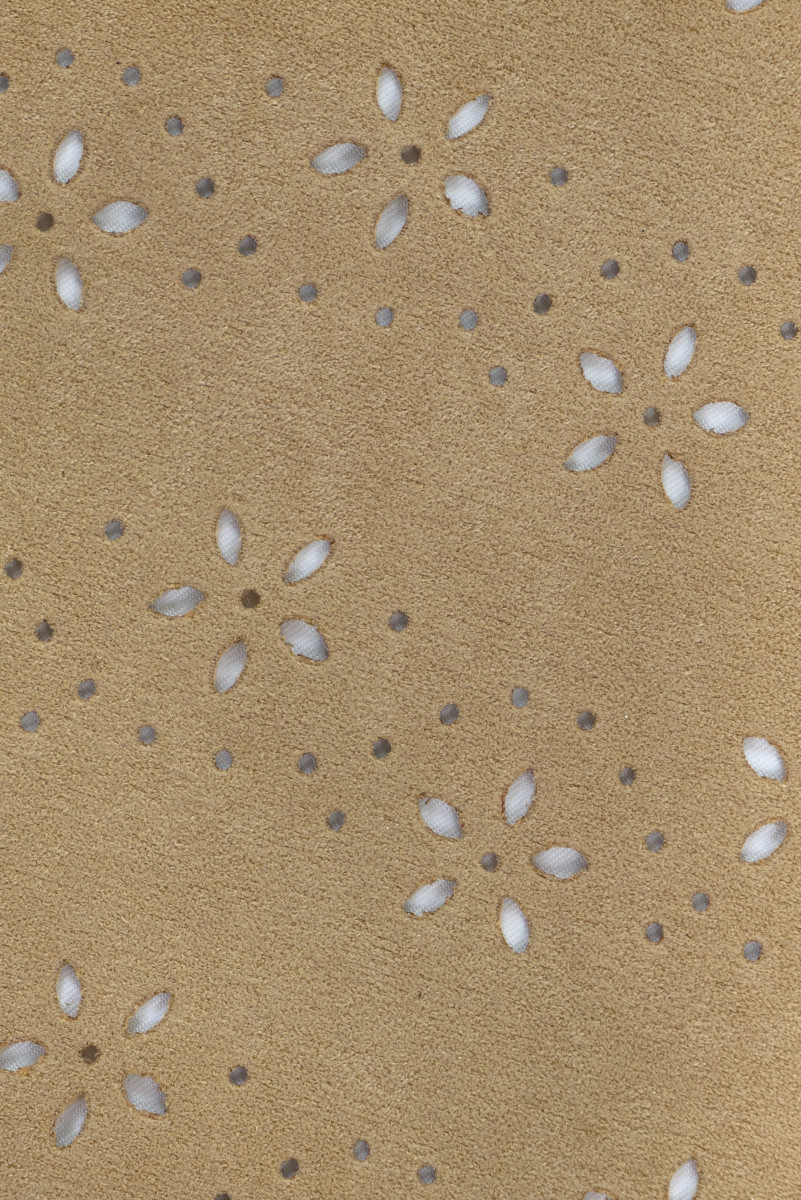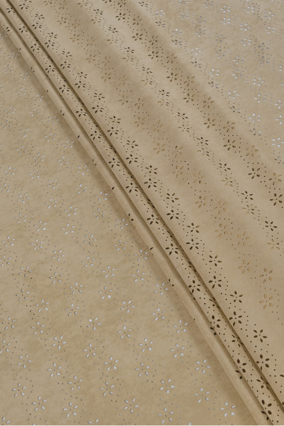 Italienskt alcantaratyg i beige med laserskurna blommor. Alcantara är ett syntetiskt tyg tillverkat av mikrofiber (mikrofibrer, upp till 20 gånger finare än ett människohår), det ser ut och känns som mocka. Mjukt, tunt, icke-elastiskt, ogenomskinligt tyg. Perfekt för att sy klänning, kjol, väst, tunn jacka.