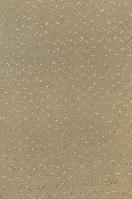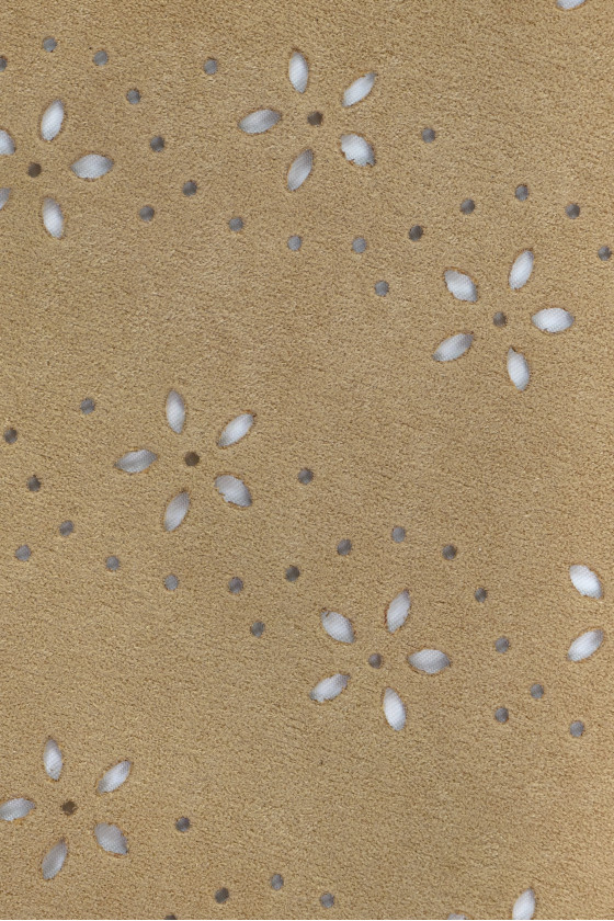 Italienskt alcantaratyg i beige med laserskurna blommor. Alcantara är ett syntetiskt tyg tillverkat av mikrofiber (mikrofibrer, upp till 20 gånger finare än ett människohår), det ser ut och känns som mocka.