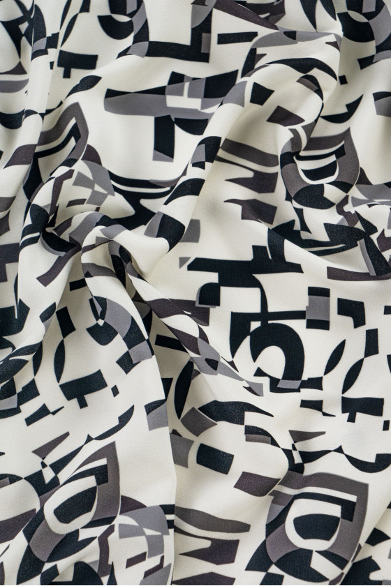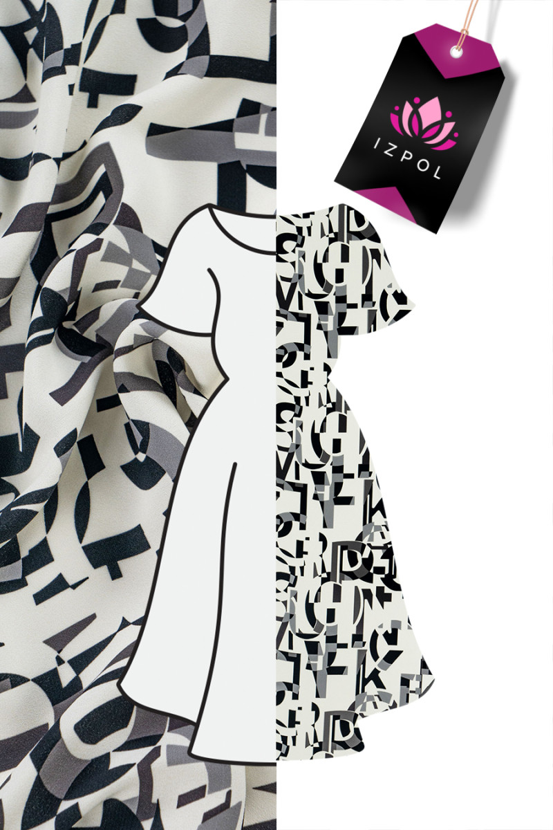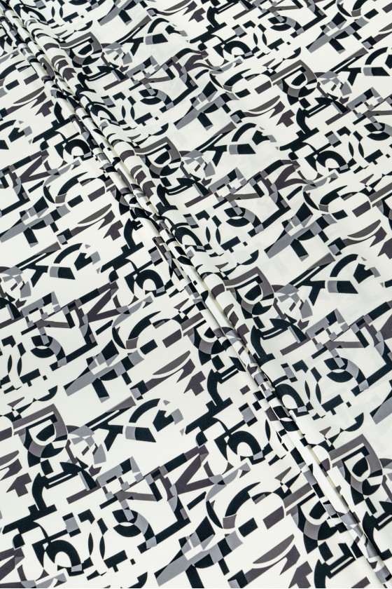 Italienskt cadi polyestertyg i écru-färg med ett motiv av grå och svarta bokstäver. Cadi-tyg är köttigt, flytande (tungt), oelastiskt, vanligtvis ogenomskinligt, men i det här fallet kräver det foder. Du kan använda den för att sy klänningar, blusar, kjolar.