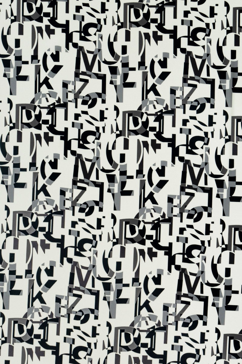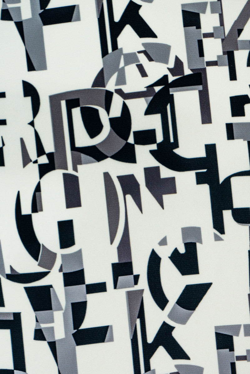 Italienskt cadi polyestertyg i écru-färg med ett motiv av grå och svarta bokstäver. Cadi-tyg är köttigt, flytande (tungt), oelastiskt, vanligtvis ogenomskinligt, men i det här fallet kräver det foder.