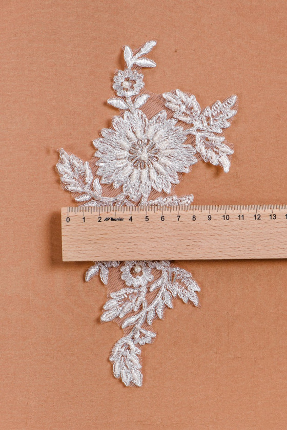 Italiensk bröllopsapplikation i krämfärg. Blommotiv dekorerat med pärlor, pärlor och transparenta paljetter och silverlurextråd. Det hela är sytt på tyll. Mått: 18cm*11cm.