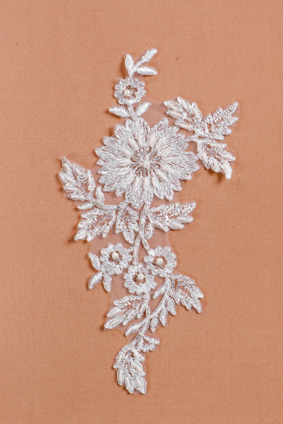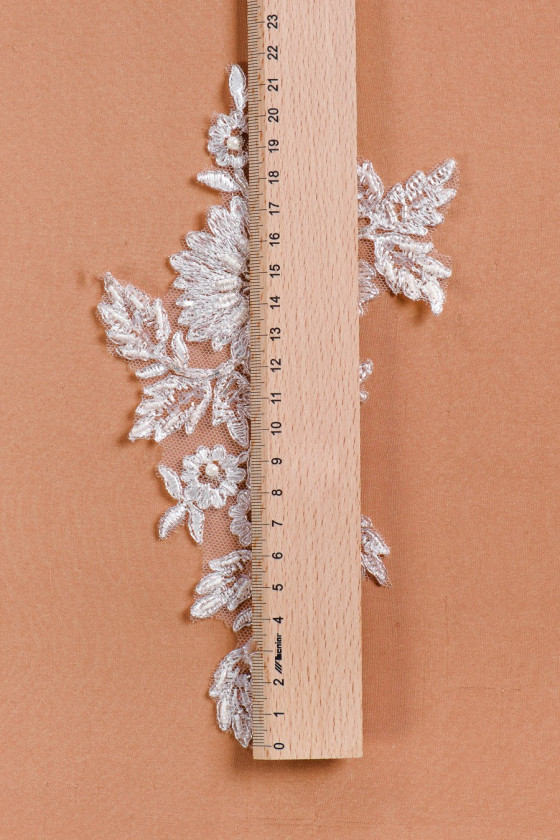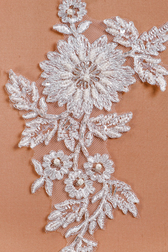 Italiensk bröllopsapplikation i krämfärg. Blommotiv dekorerat med pärlor, pärlor och transparenta paljetter och silverlurextråd. Det hela är sytt på tyll.