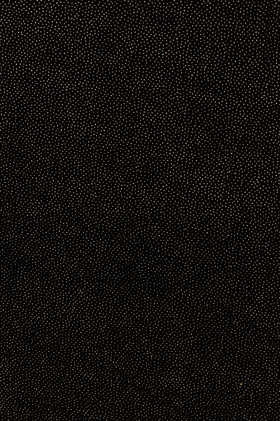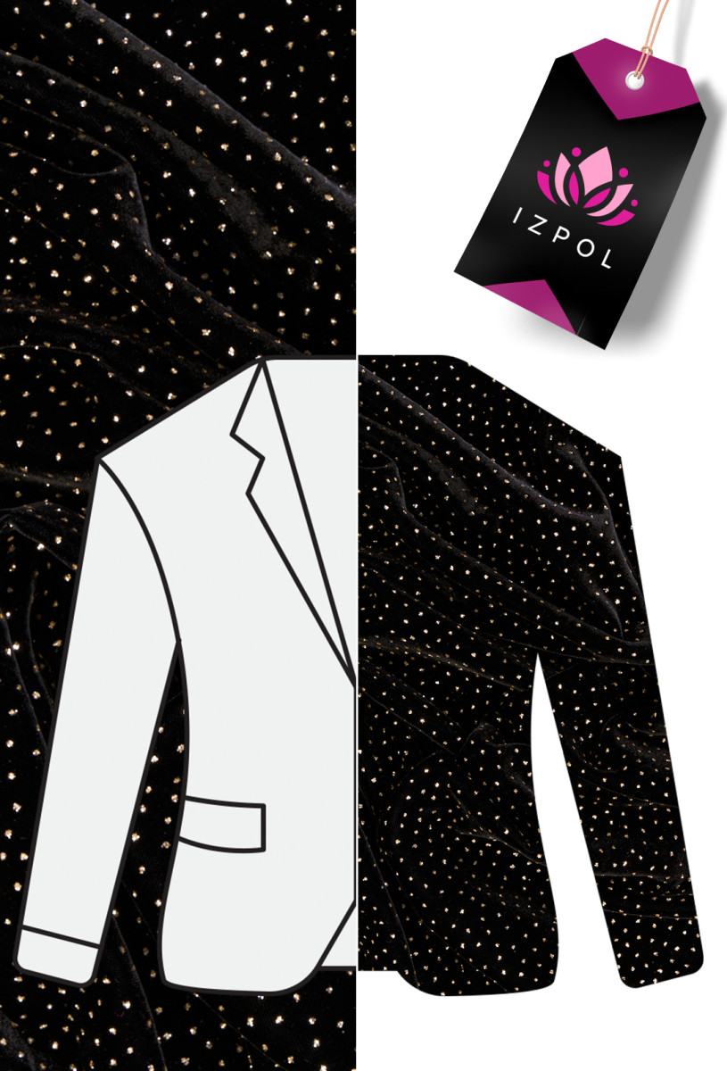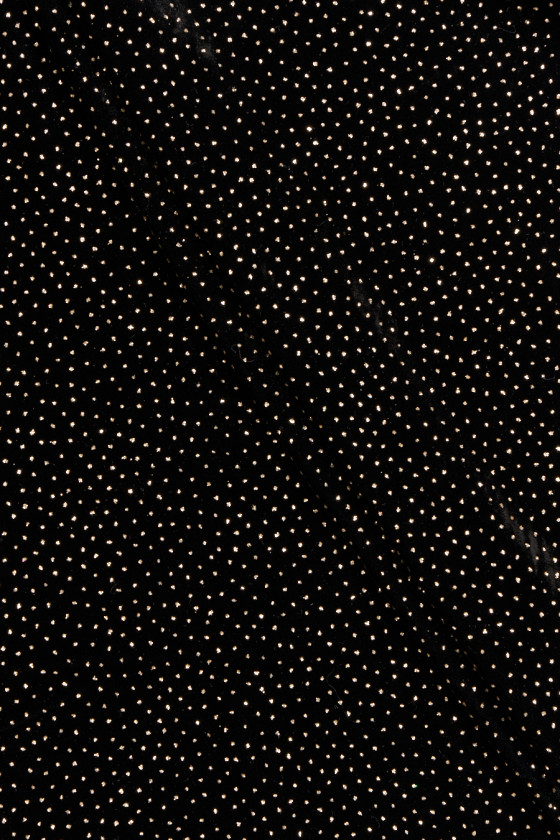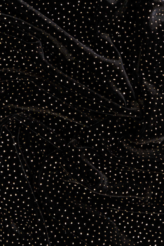 Italiensk, exklusiv velour i svart dekorerad med fint guldglitter. Tyget är mjukt, flytande, icke-elastiskt, tunt men ogenomskinligt. Det faller vackert och glitterdekorationen ger tyget ett unikt utseende. Ett underbart förslag för att skapa en formell klänning, kjol eller blus. Glitterprickar faller av något, vi rekommenderar att du förkrymper.