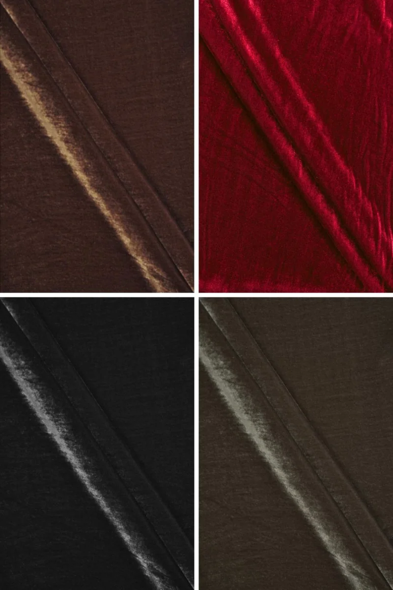 Italiensk, exklusiv sammet i ett intressant färgspektrum vävt med siden. Tyget är mjukt, flödande, oelastiskt, tunt men ogenomskinligt. Den ligger vackert, och den ädla glansen gör tyget mycket elegant. Ett fantastiskt förslag att skapa en formell klänning, kjol eller blus.