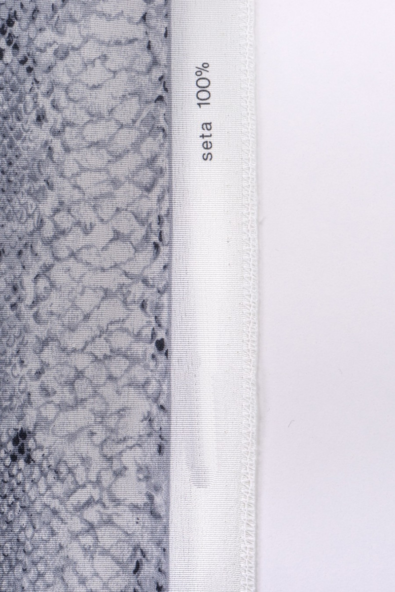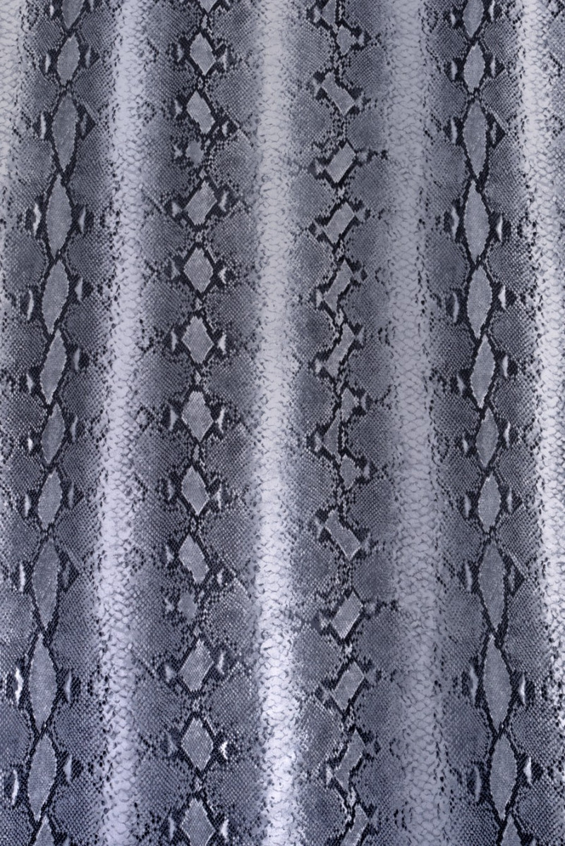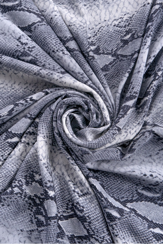 Tjockare siden med grått ormmönster, tungt, böljande, matt tyg. Vi rekommenderar den för klänningar, byxor, kjolar.