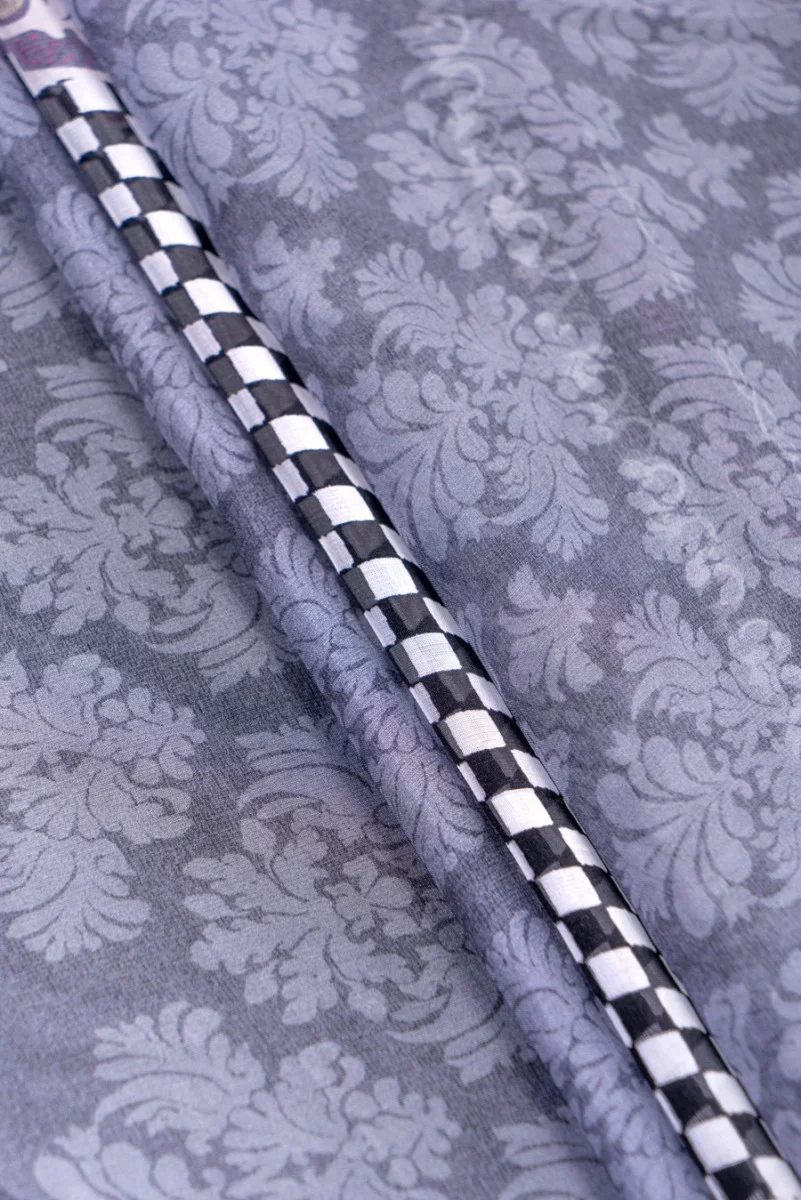 Italiensk sidenchiffong i en intressant kupong 135*140 cm. Mönstret börjar med en dekorativ rand som är 20 cm bred och övergår sedan i ett mönster av en dekorativ mosaik i grått med inslag av antikrosa och ett vitt och svart schackbräde.
