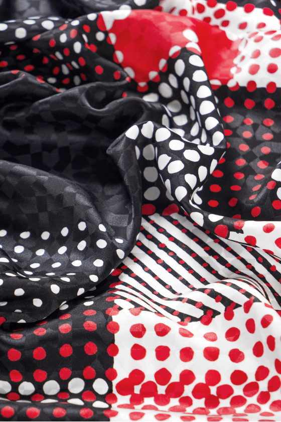 Italienskt 100% sidentyg med jacquardväv, geometriska motiv i följande färger: svart, rött och grädde. Lätt, mjukt, böljande tyg - perfekt för att sy en skjorta, klänning, luftig kjol, blus eller sjal.