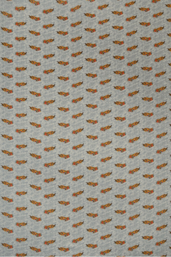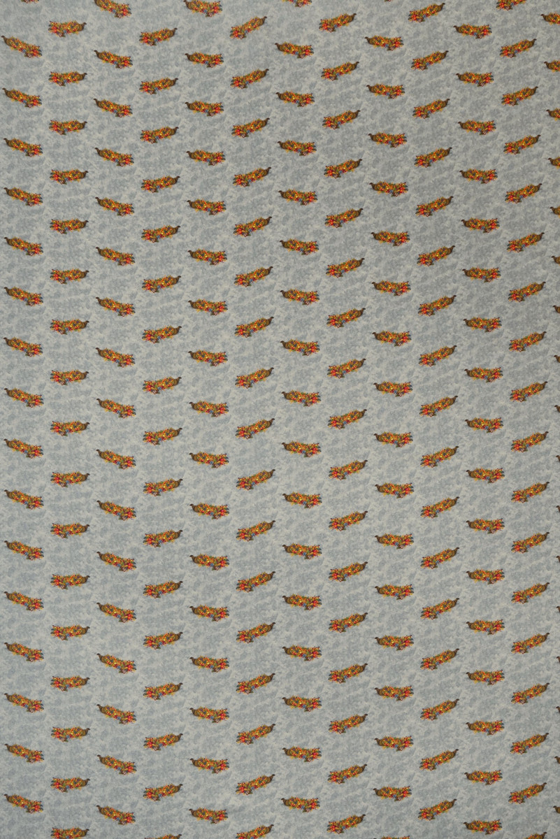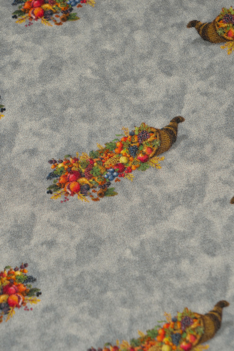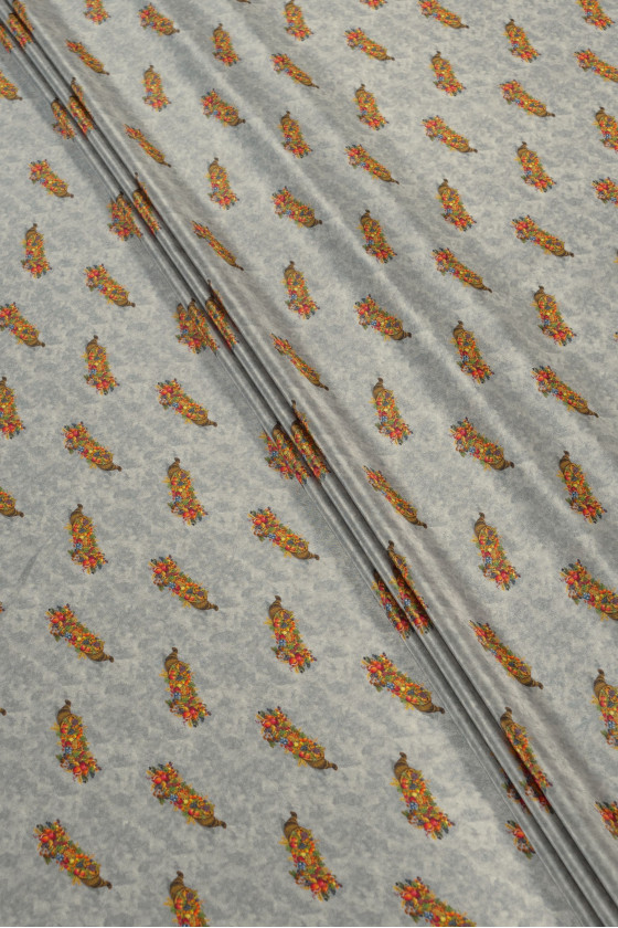 Italiensk crepe 100% siden med "Cornucopia"-motiv (6 cm) på en grå botten. Silk crêpe är ett känsligt, tunt, halvmatt tyg.