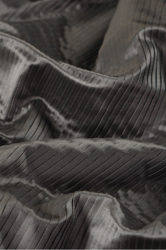 Italienskt tyg 100% siden, plisserat i grått. Tyget är limmat med ett tunt mellanlägg. Tyget är tunnare, något styvt, veckat runt omkretsen med en glans som är karakteristisk för sidentyger.