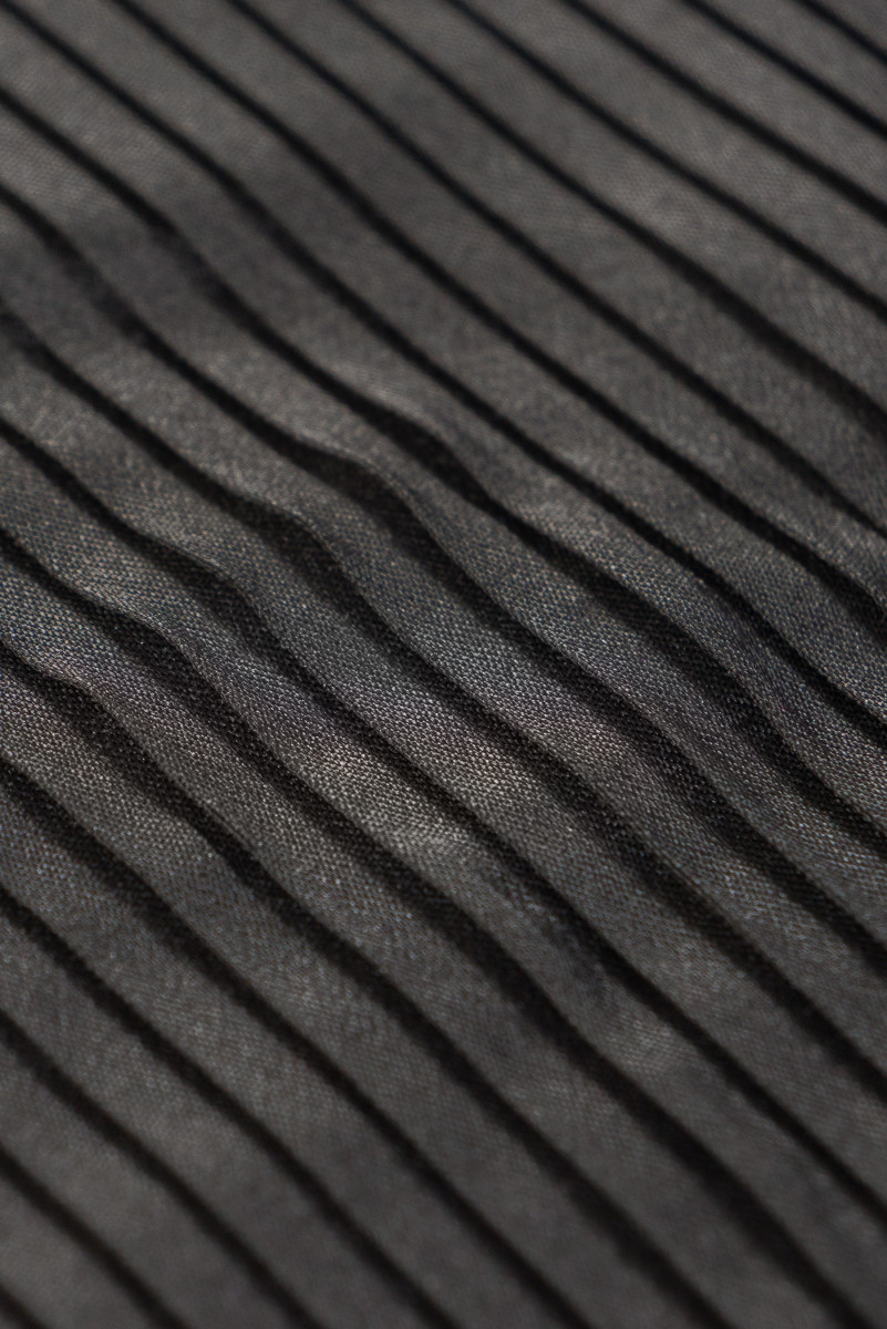 Italienskt tyg 100% siden, plisserat i grått. Tyget är limmat med ett tunt mellanlägg. Tyget är tunnare, något styvt, veckat runt omkretsen med en glans som är karakteristisk för sidentyger. Perfekt för att sy klänning, blus, kjol.
