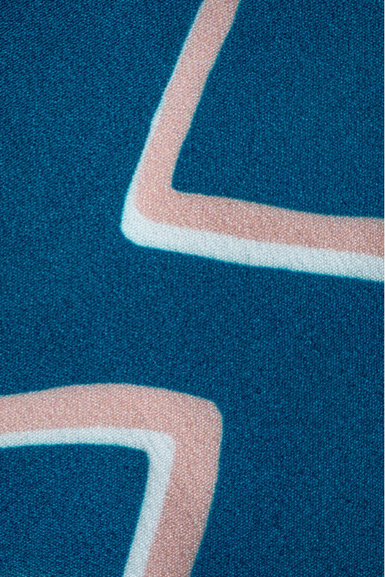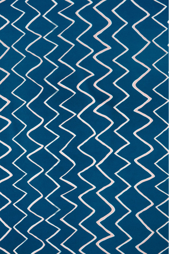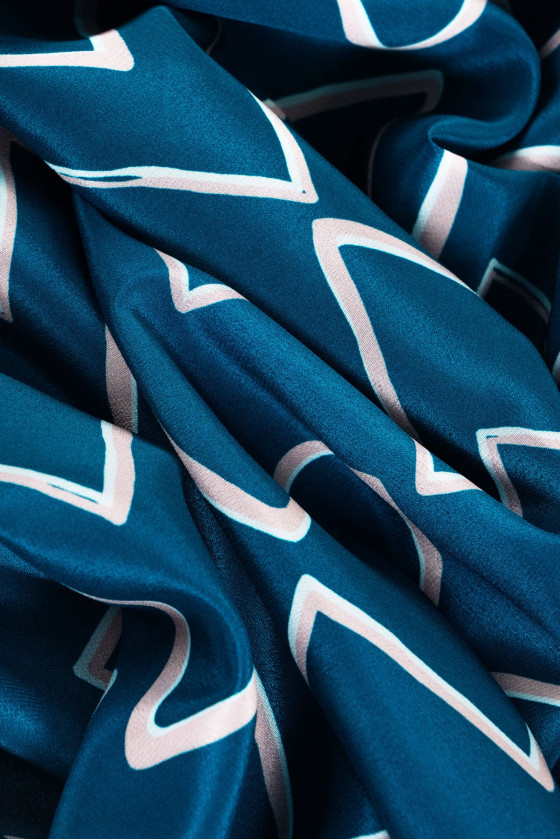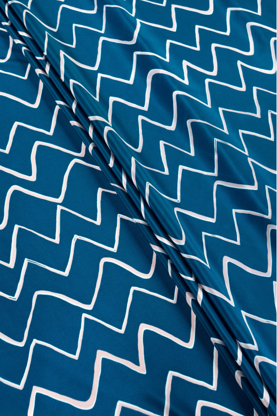 Italiensk 100 % sidencrêpe i blågrönt med ett motiv av laxsicksack, arrangerade vertikalt (längs tygets längd). Sidencrêpe är ett känsligt, tunt, halvmatt tyg. Den är mjuk vid beröring och sitter mycket bra.