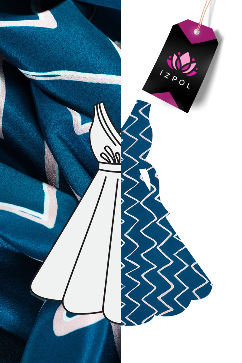 Italiensk 100 % sidencrêpe i blågrönt med ett motiv av laxsicksack, arrangerade vertikalt (längs tygets längd). Sidencrêpe är ett känsligt, tunt, halvmatt tyg. Den är mjuk vid beröring och sitter mycket bra. Den kan användas för att trolla fram luftiga klänningar, känsliga blusar, kjolar, halsdukar, halsdukar.