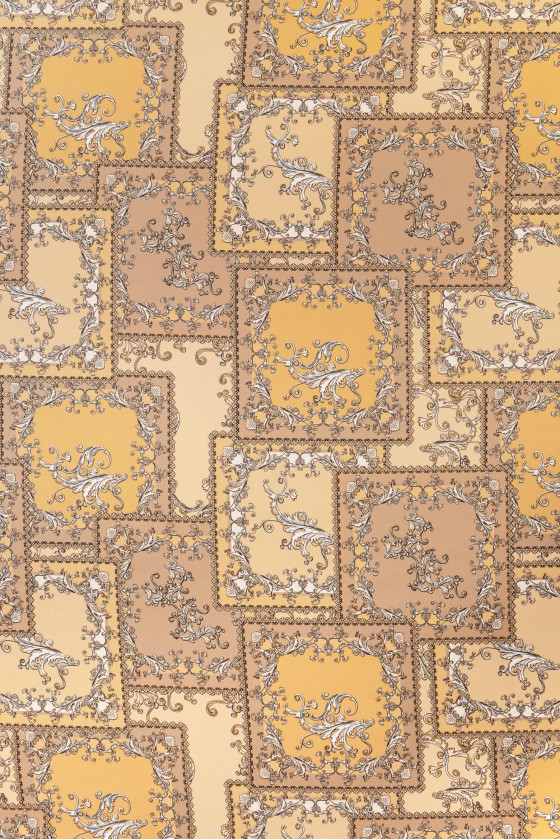 Italiensk satin 100% siden i olika nyanser av beige med ett motiv av svart, små ornament som skapar ett lapptäcksmotiv - trycket är gjort på en matt sida. Sidensatin är ett tätt och lätt tyg med en plan yta, tillverkat i en satinväv. En ytterligare fördel är dess jämnhet och hållbarhet, liksom det faktum att den sitter mycket bra, inte syns igenom och är behaglig att ta på. Å ena sidan är den matt och å andra sidan är den ädelt glänsande. Den kan användas för att trolla fram luftiga klänningar, känsliga blusar, kjolar, halsdukar, halsdukar.