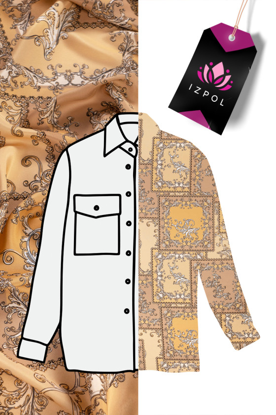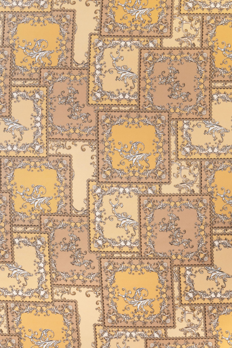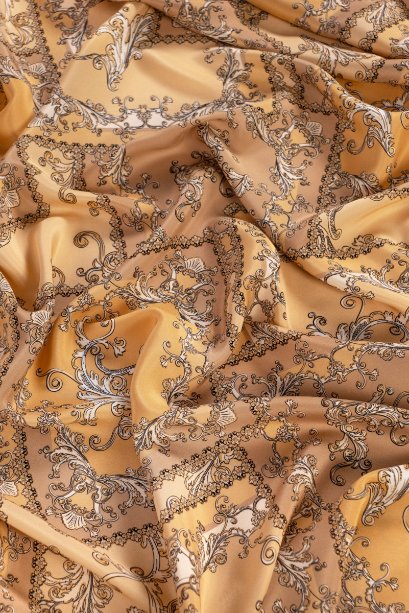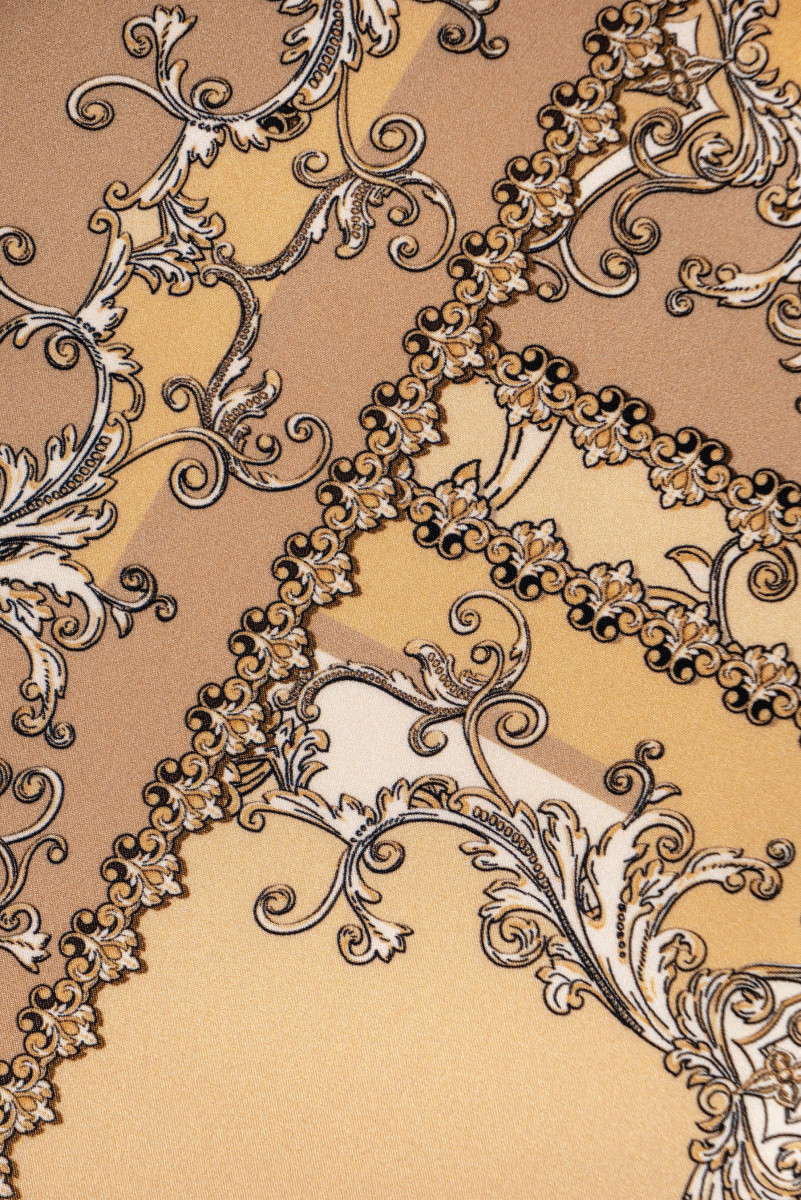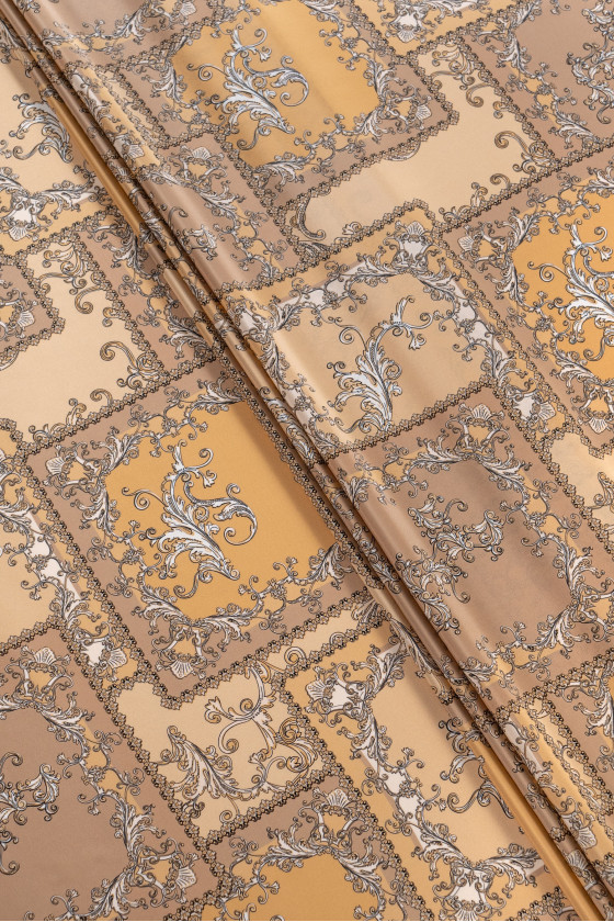 Italiensk satin 100% siden i olika nyanser av beige med ett motiv av svart, små ornament som skapar ett lapptäcksmotiv - trycket är gjort på en matt sida. Sidensatin är ett tätt och lätt tyg med en plan yta, tillverkat i en satinväv. En ytterligare fördel är dess jämnhet och hållbarhet, liksom det faktum att den sitter mycket bra, inte syns igenom och är behaglig att ta på.